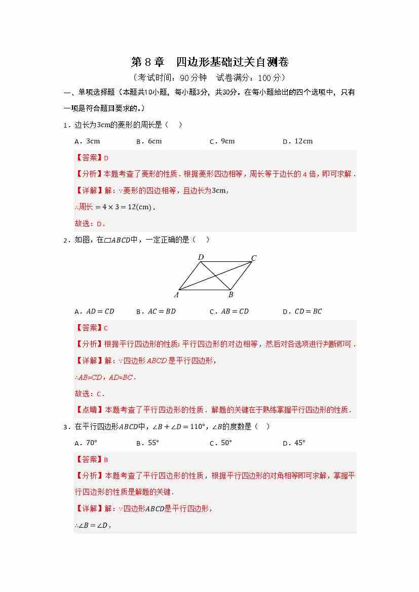 第8章 四边形基础过关自测卷(解析版)