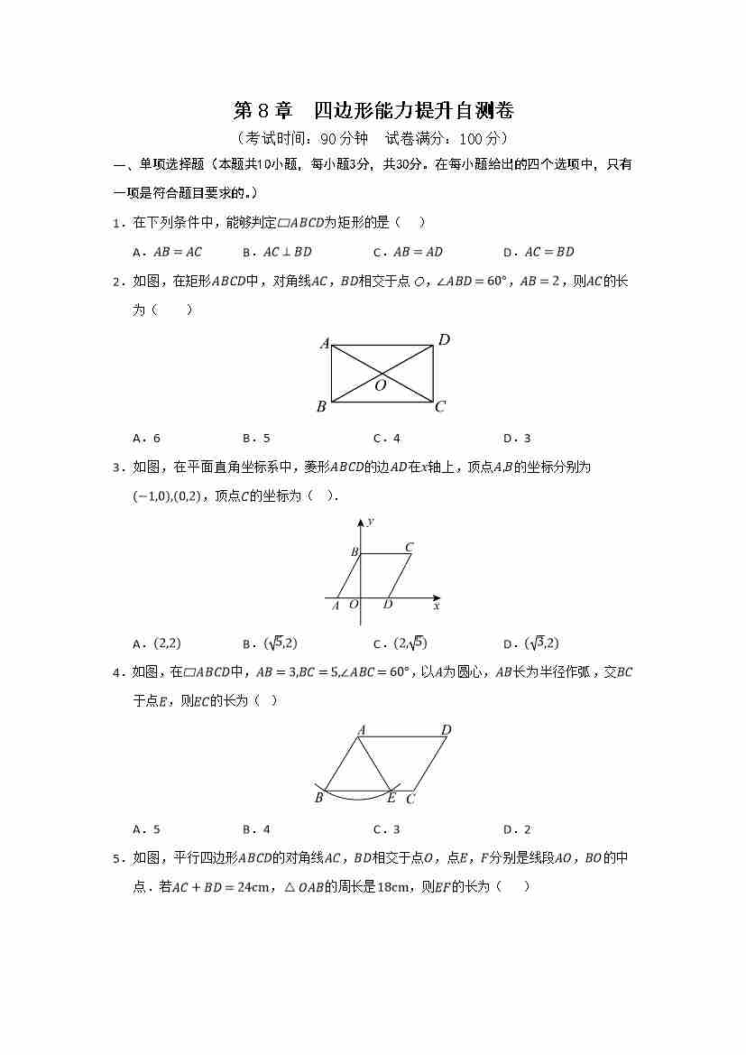 第8章 四边形能力提升自测卷(考试版)