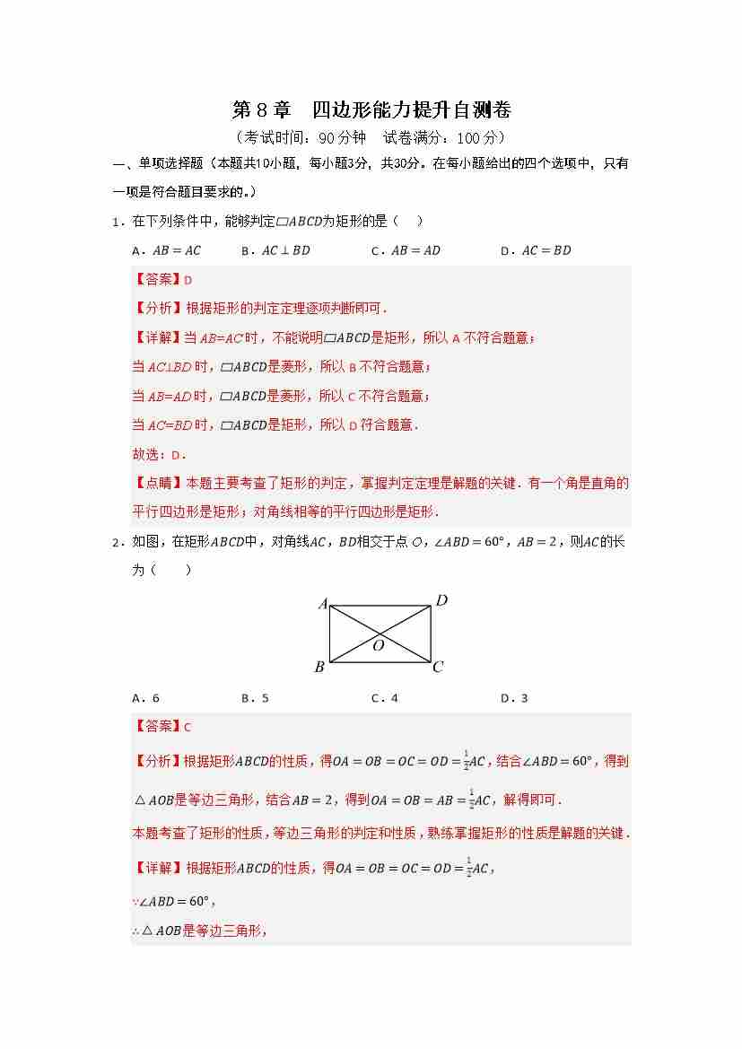 第8章 四边形能力提升自测卷(解析版)