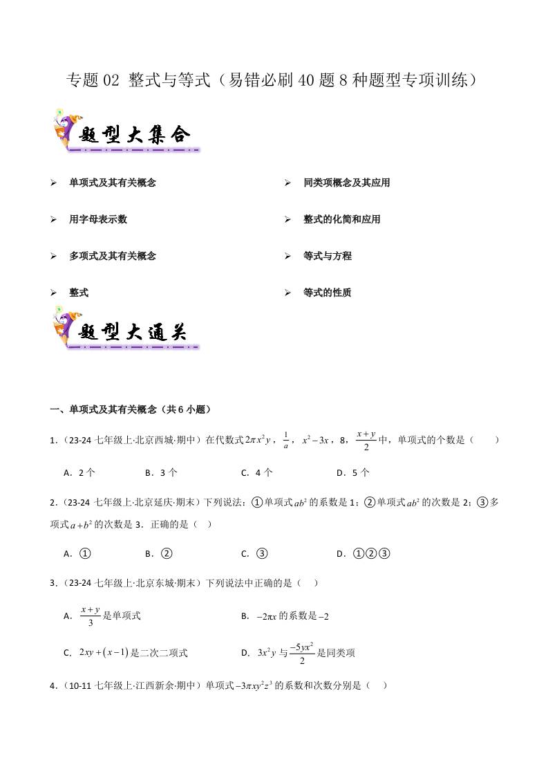 专题02 整式与等式(易错必刷40题8种题型专项训练)(学生版)