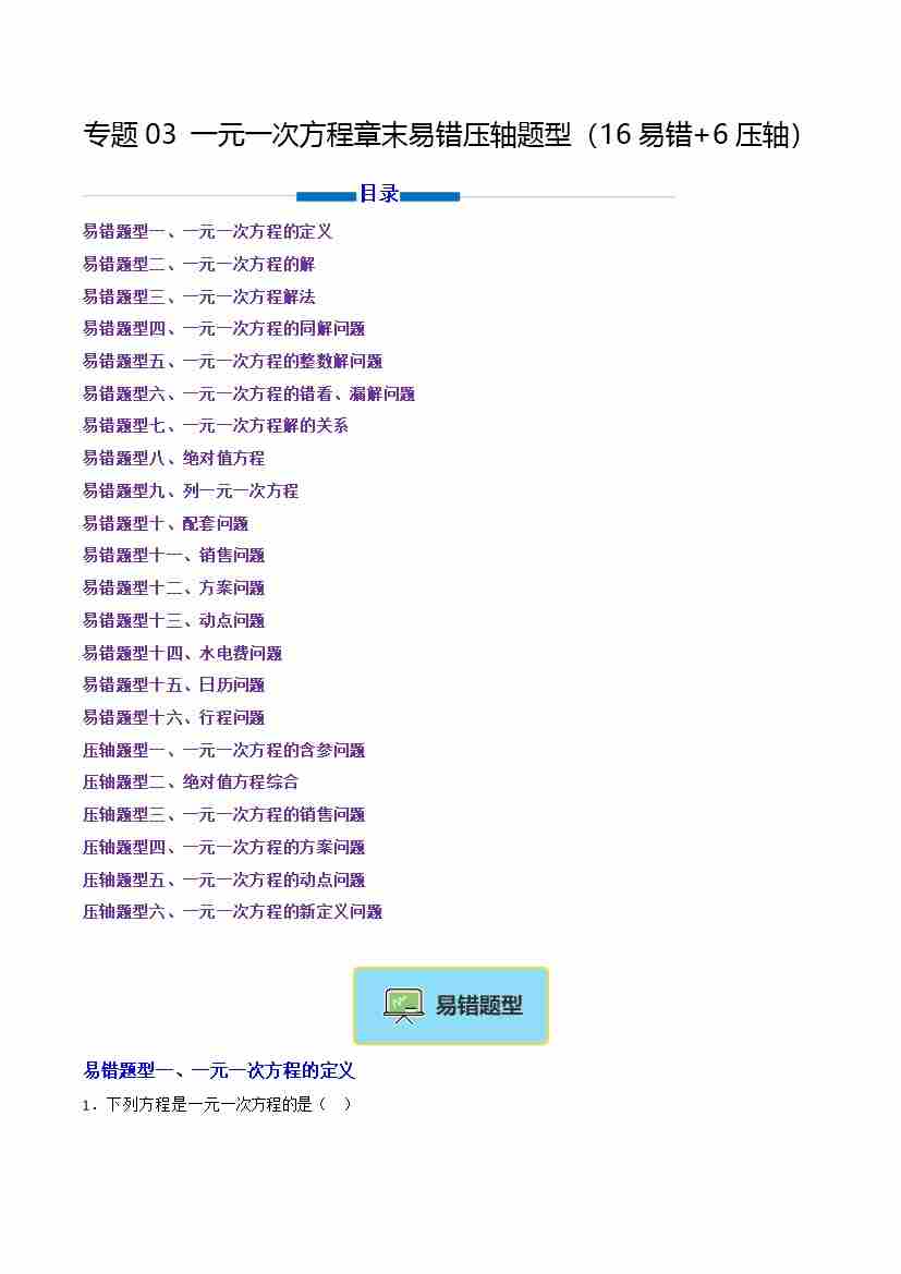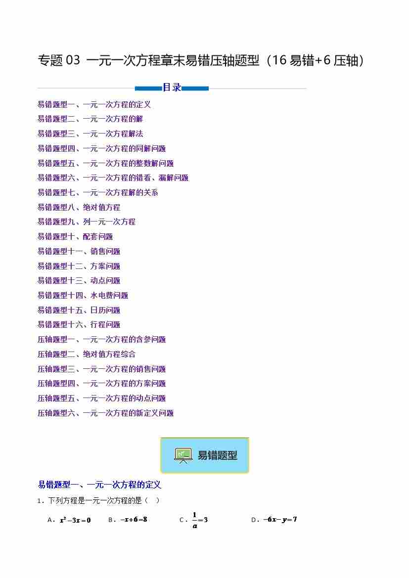 专题03 一元一次方程章末易错压轴题型(专项训练)(学生版)