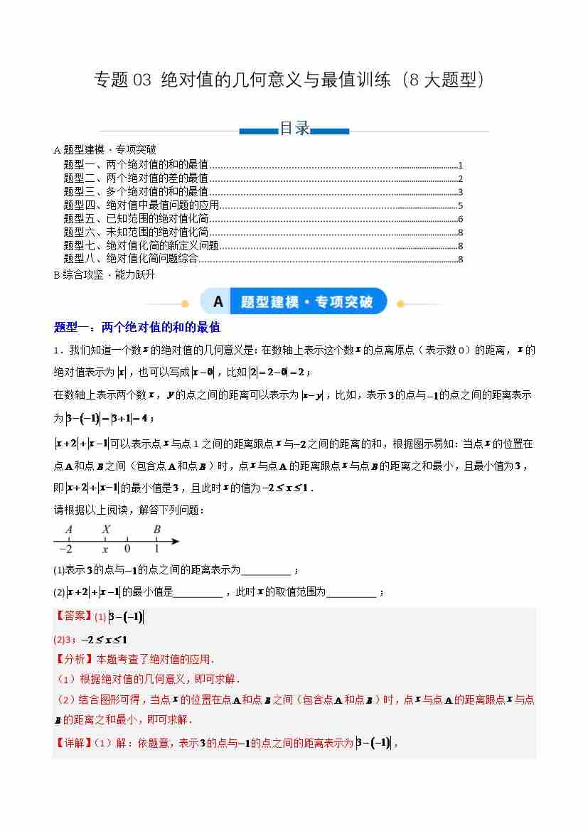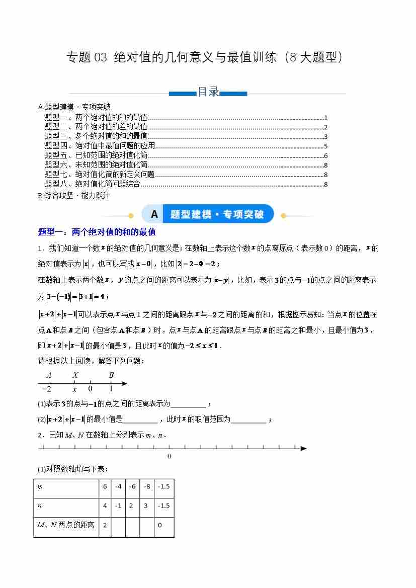 专题03 绝对值的几何意义与最值训练8大题型(专项训练)(学生版)