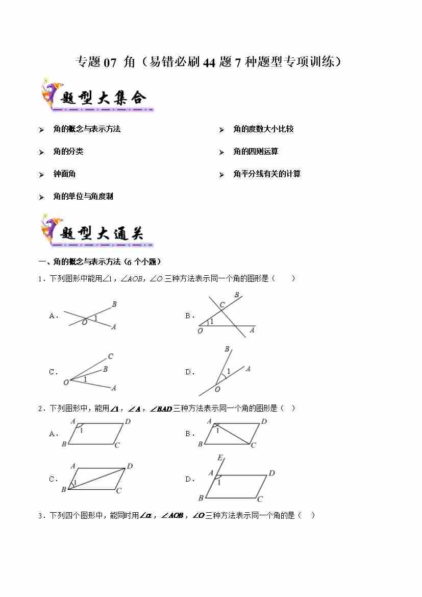 专题07 角(考题猜想,易错必刷44题7种题型专项训练)(学生版)