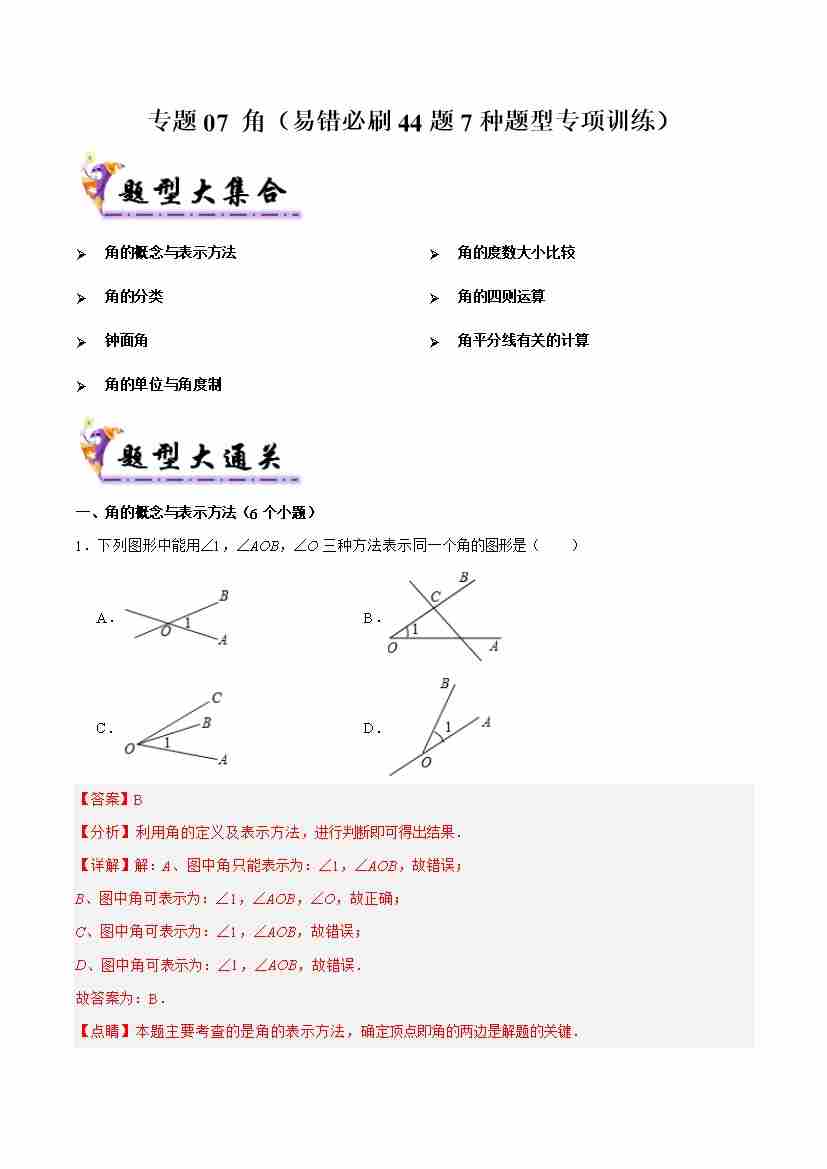 专题07 角(考题猜想,易错必刷44题7种题型专项训练)(教师版)