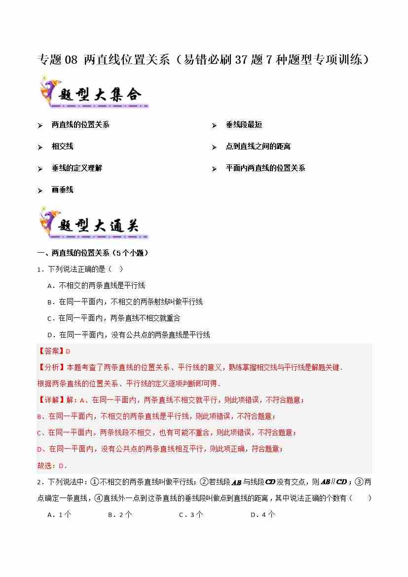 专题08 两直线位置关系(考题猜想,易错必刷37题7种题型专项训练)(教师版)
