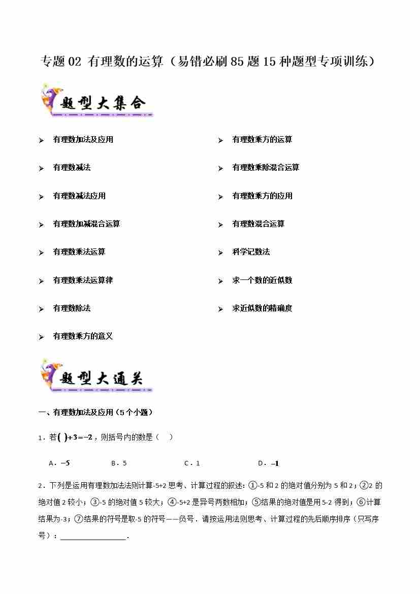 专题02 有理数的运算(考题猜想 易错必刷85题15种题型)(学生版)