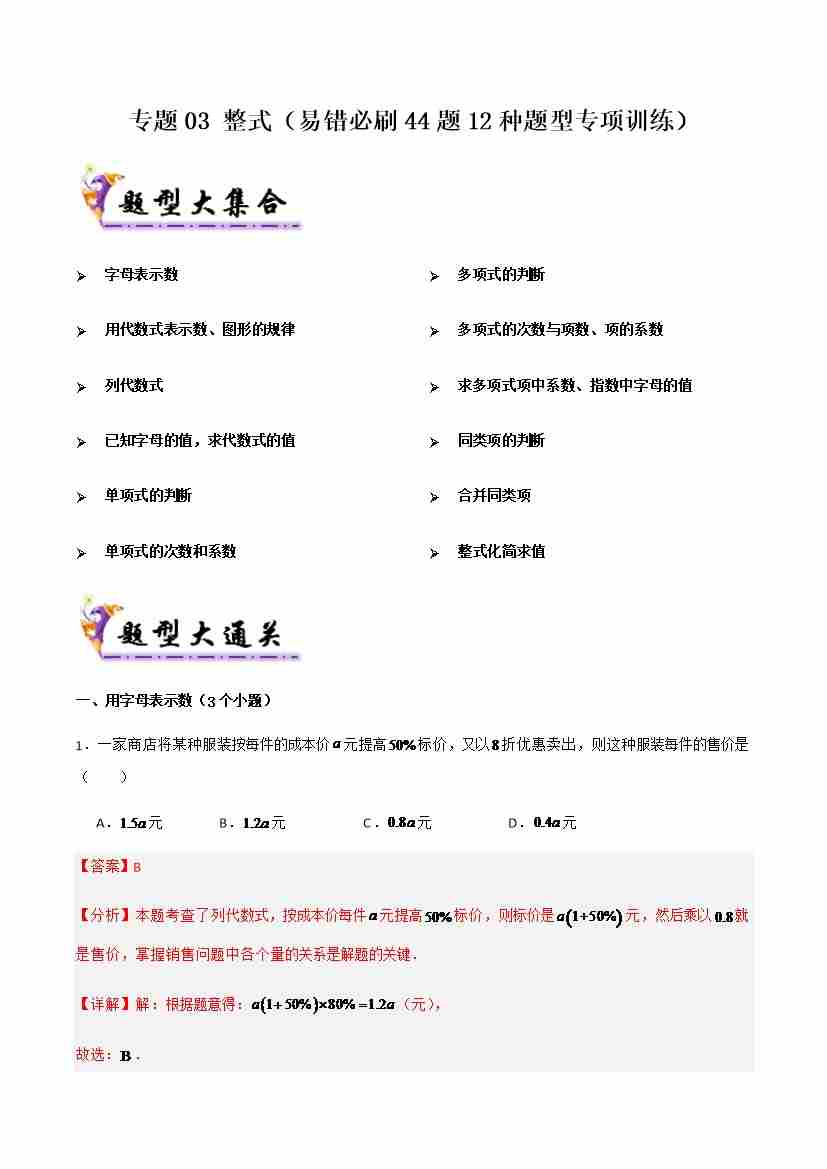 专题03 整式(考题猜想,易错必刷44题12种题型专项训练)(教师版)
