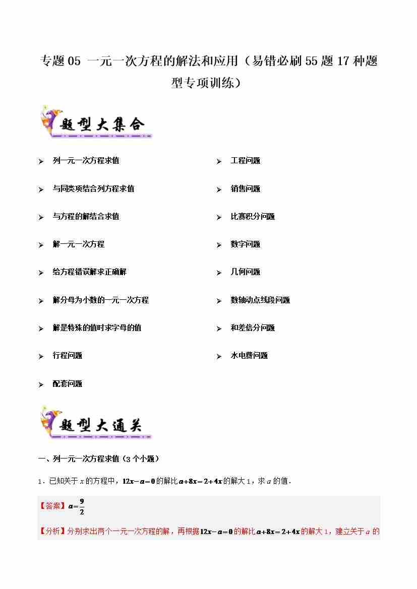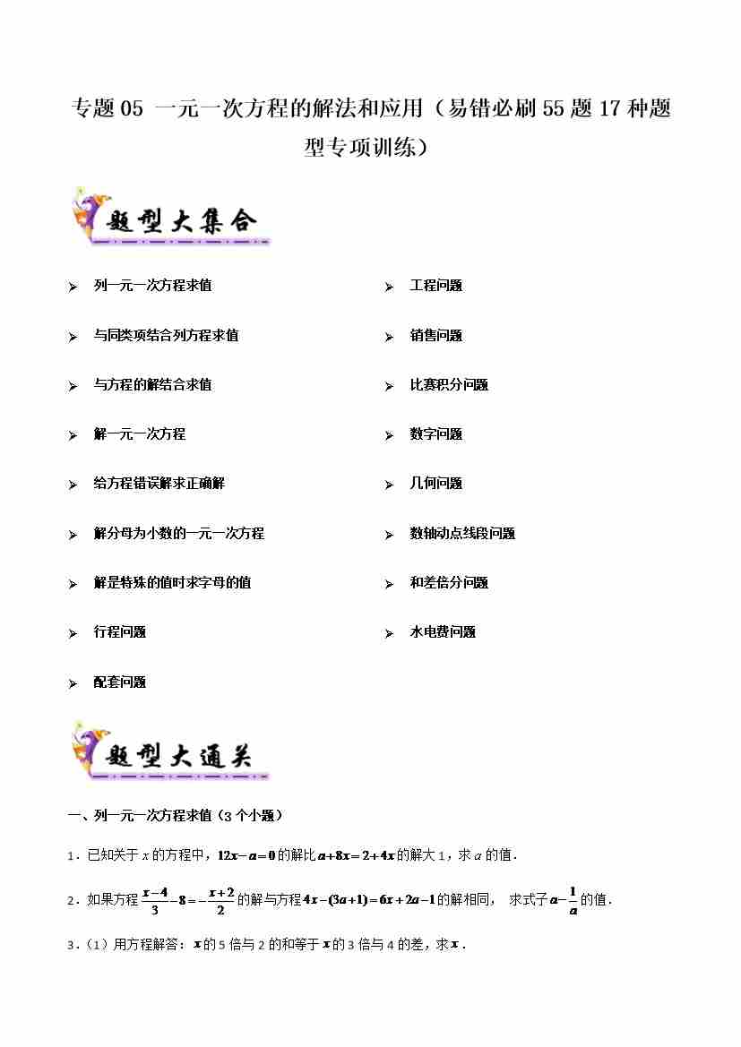 专题05 一元一次方程的解法和应用(考题猜想,易错必刷55题17种题型专项训练)(学生版)