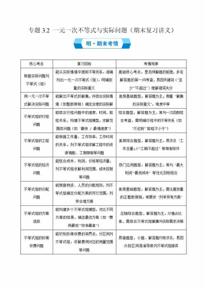 专题3.2 一元一次不等式与实际问题(期末复习讲义)学生版