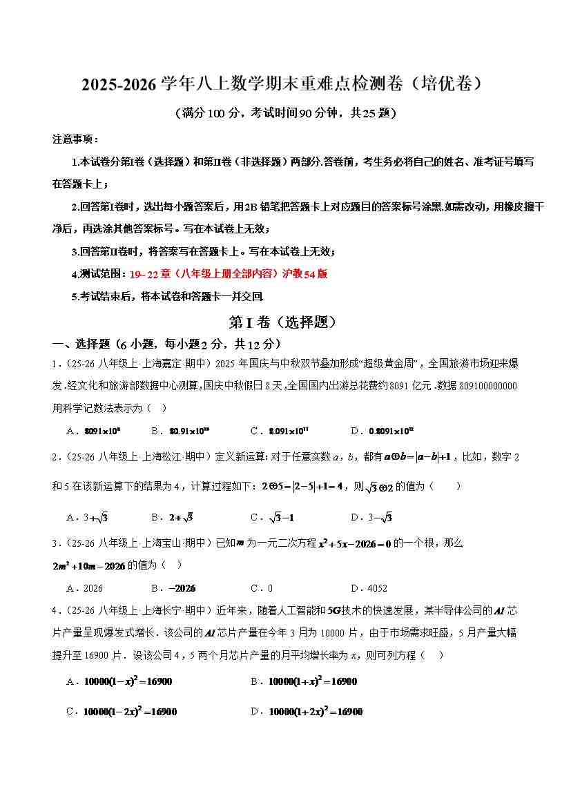 八上数学沪教54期末重难点检测卷(培优卷)(考试范围:19~22章 八年级上册全部内容)(原卷版)