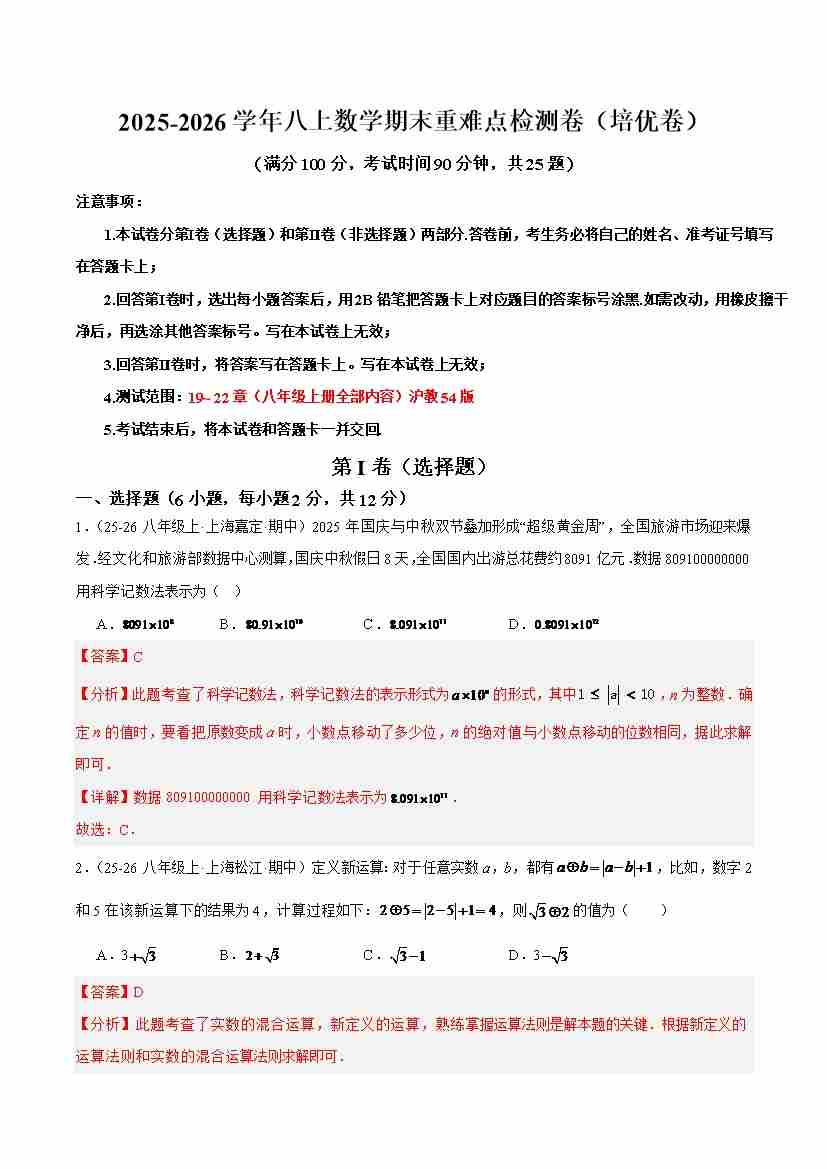 八上数学沪教54期末重难点检测卷(培优卷)(考试范围:19~22章 八年级上册全部内容)(解析版)