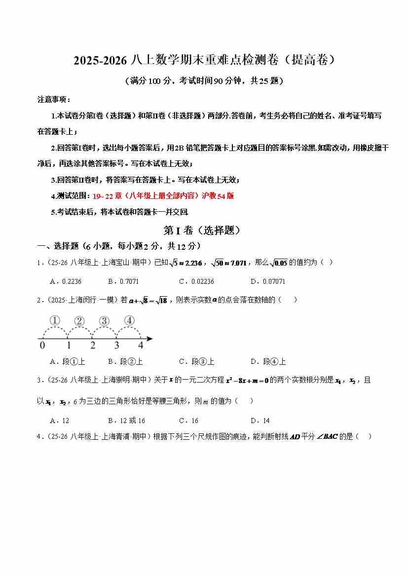 八上数学沪教54期末重难点检测卷(提高卷)(考试范围:19~22章 八年级上册全部内容)(原卷版)