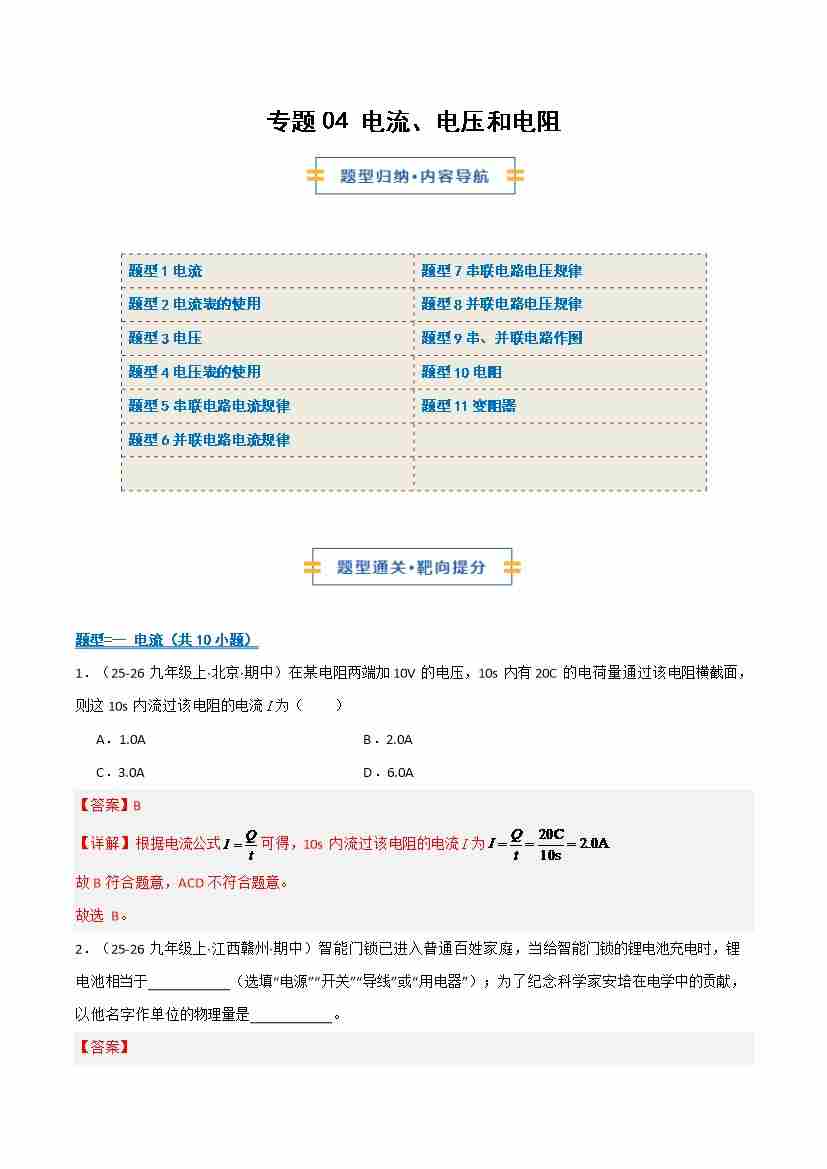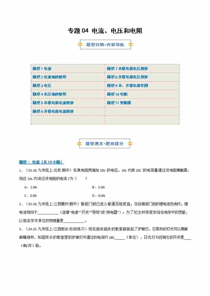 专题04 电流、电压和电阻(期末专项训练)(学生版)