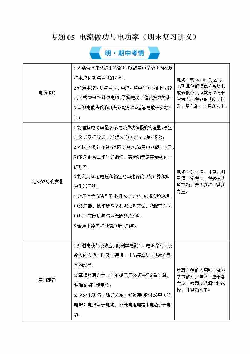 专题05 电流做功与电功率(期末复习讲义)学生版