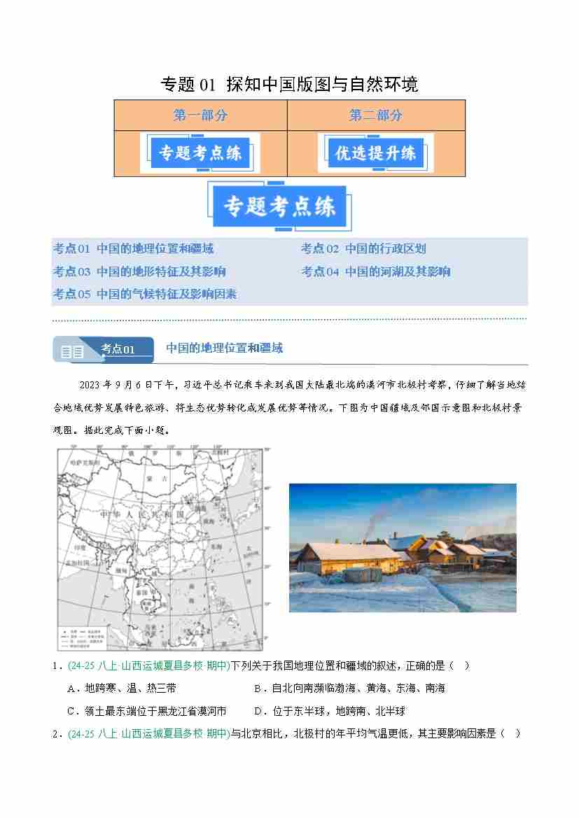 专题01 探知中国版图与自然环境(百题精选)(期中真题汇编)(原卷版)