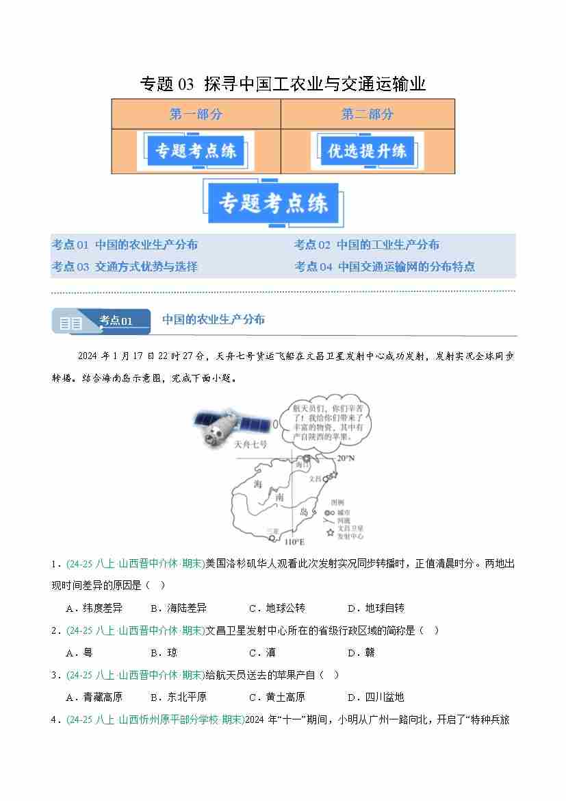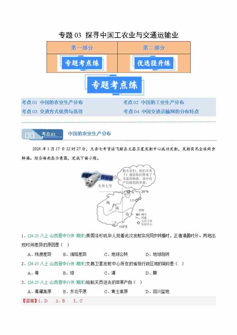 专题03 探寻中国工农业与交通运输业(百题精选)(期中真题汇编)(解析版)