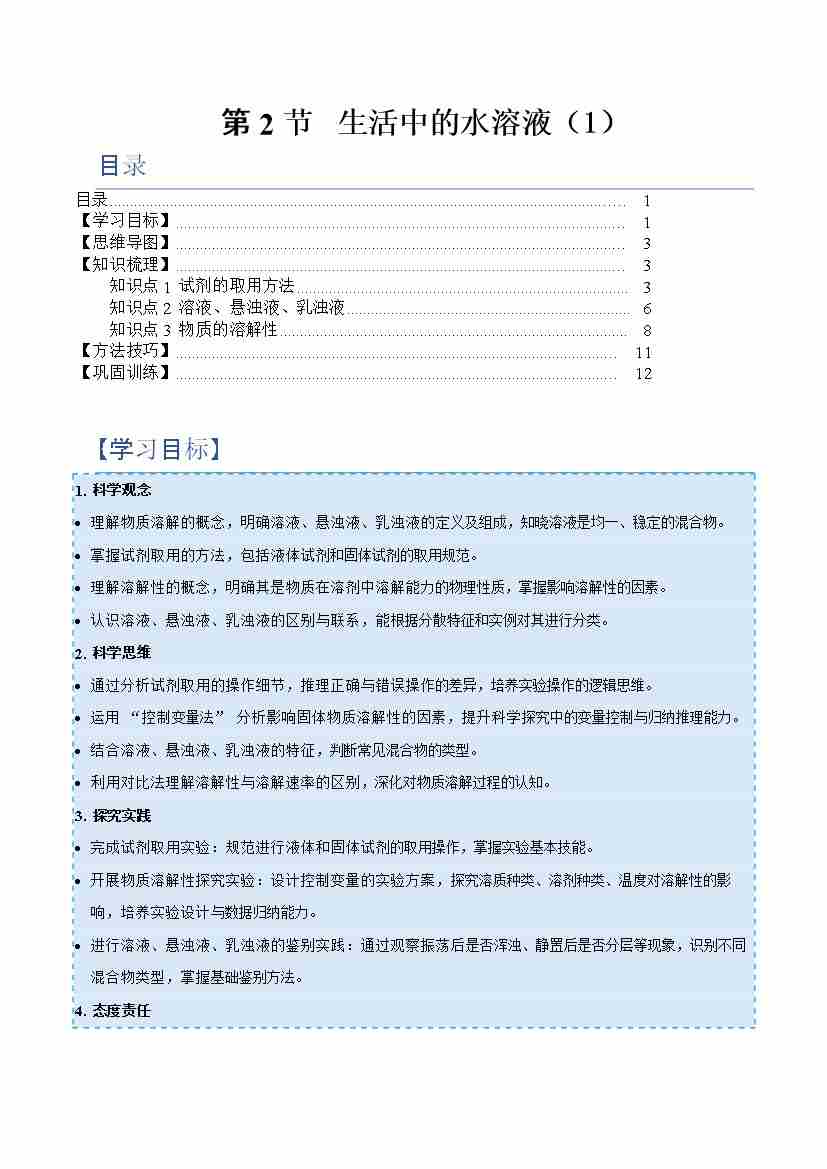第2节 生活中的水溶液 第1课时(举一反三讲义)(原卷版)
