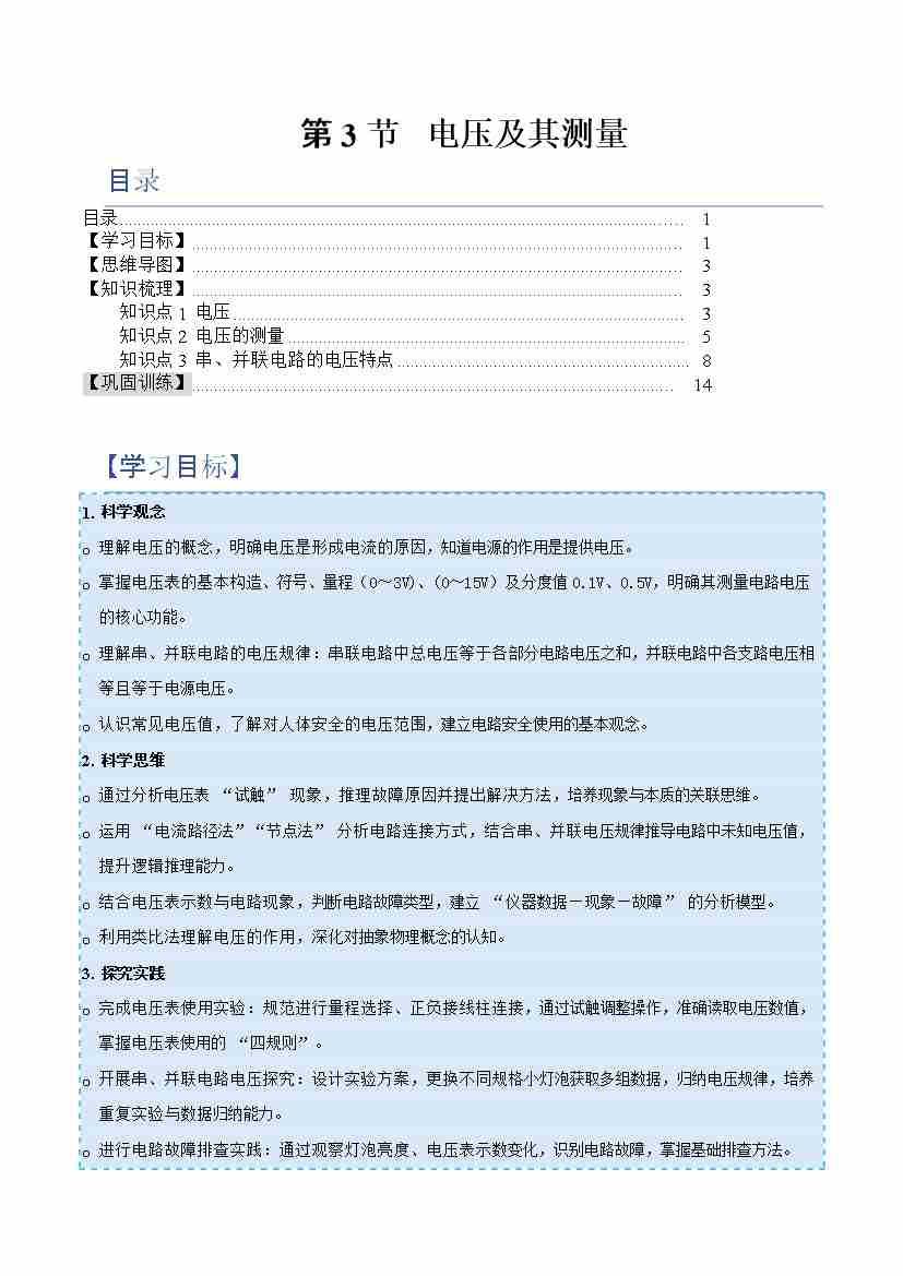 第3节 电压及其测量(举一反三讲义)(原卷版)