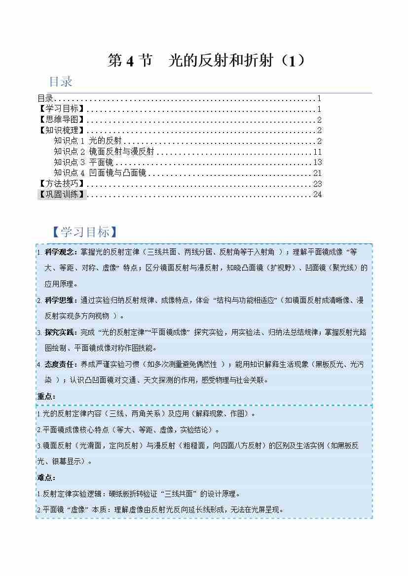 第4节 光的反射和折射 第1课时(举一反三讲义)(原卷版)