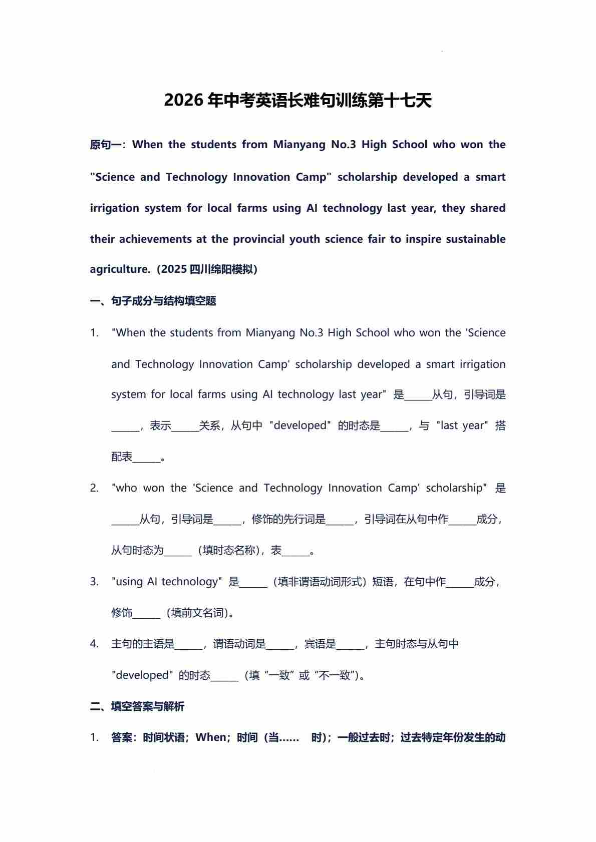 2026年中考英语长难句训练第十七天