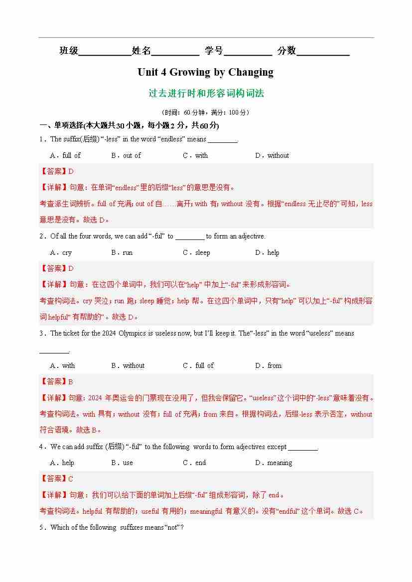 Unit 4 Changing and Growing 语法Grammar 过去进行时和形容词构词法(解析版)