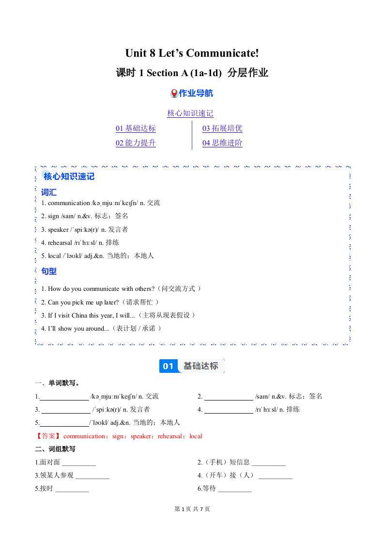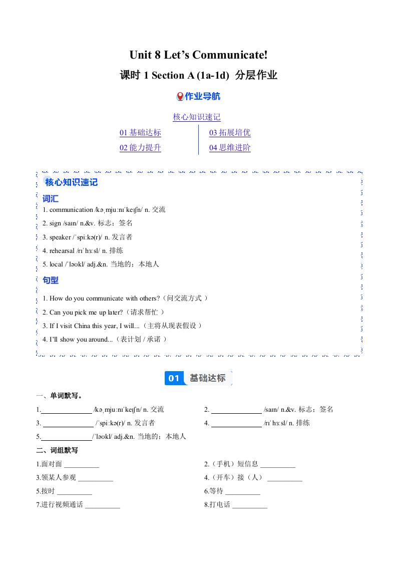 Unit 8 课时1 Section A(1a-1d)(分层作业)(原卷版)
