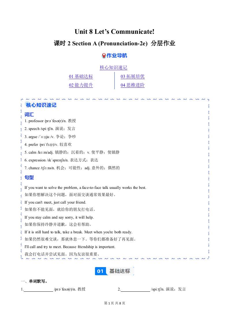 Unit 8 课时2 Section A(Pronunciation-2e)(分层作业)(原卷版)
