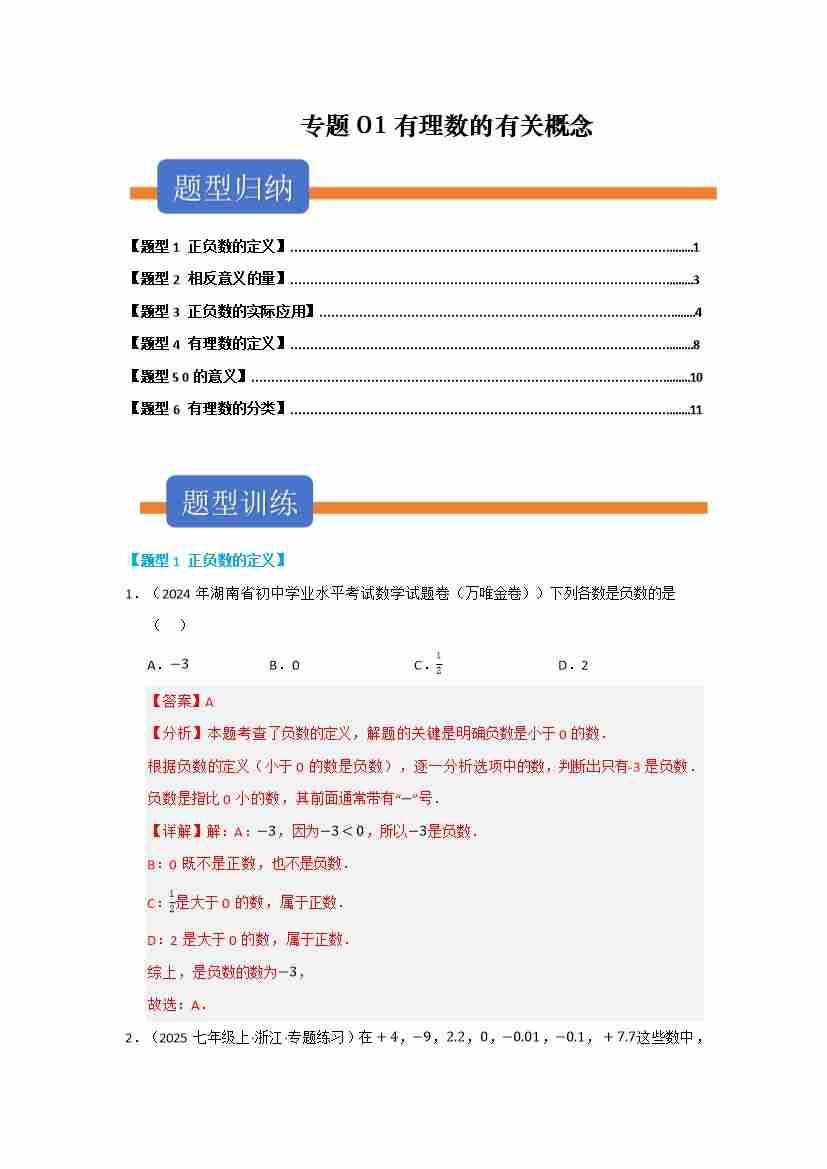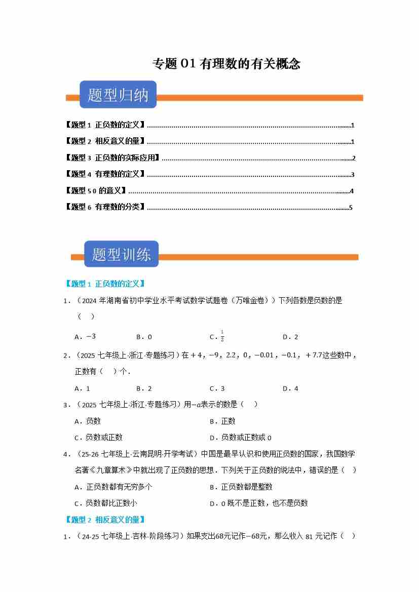 专题01 有理数的有关概念(七大高频题型两大易错题型)(学生版)