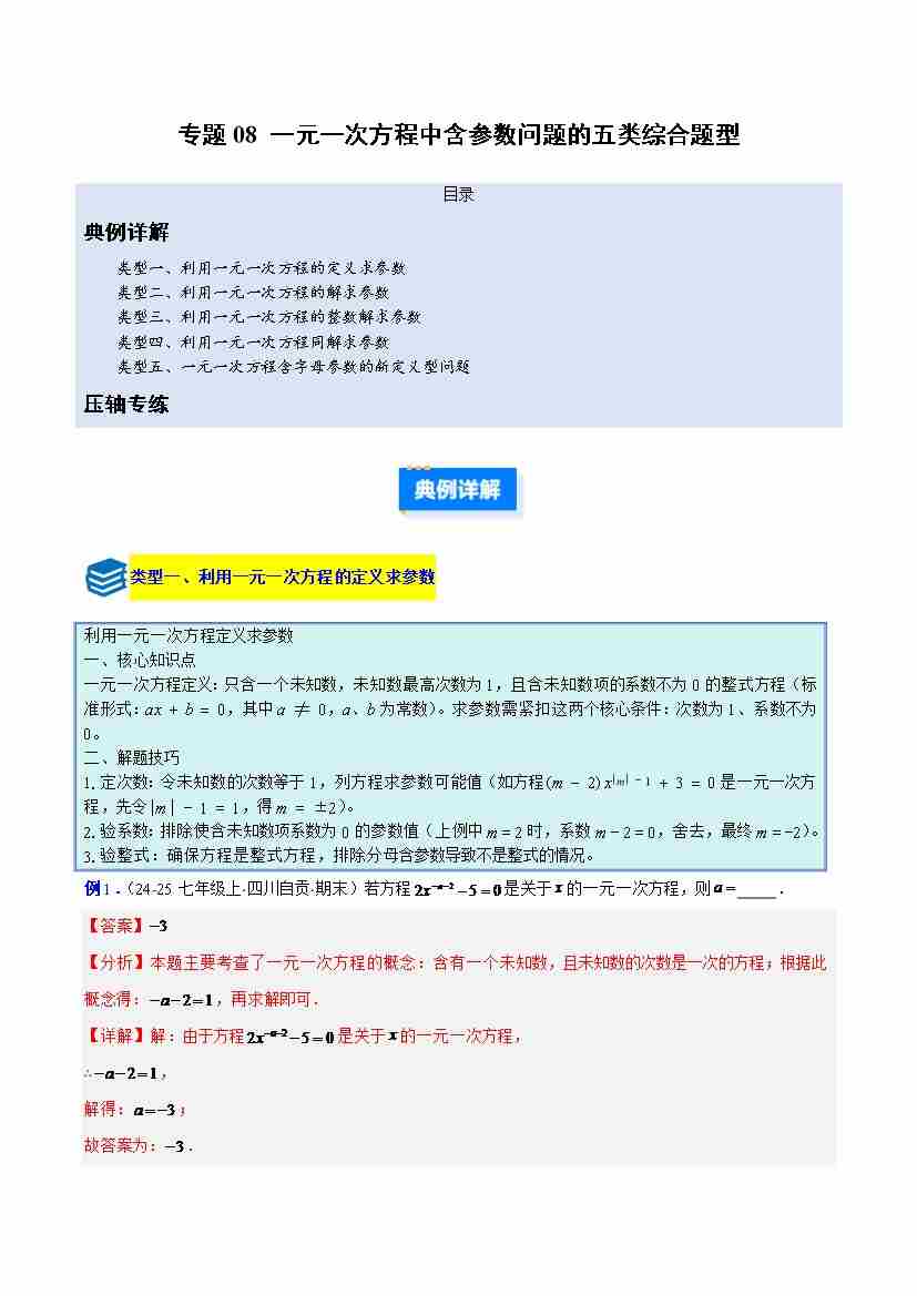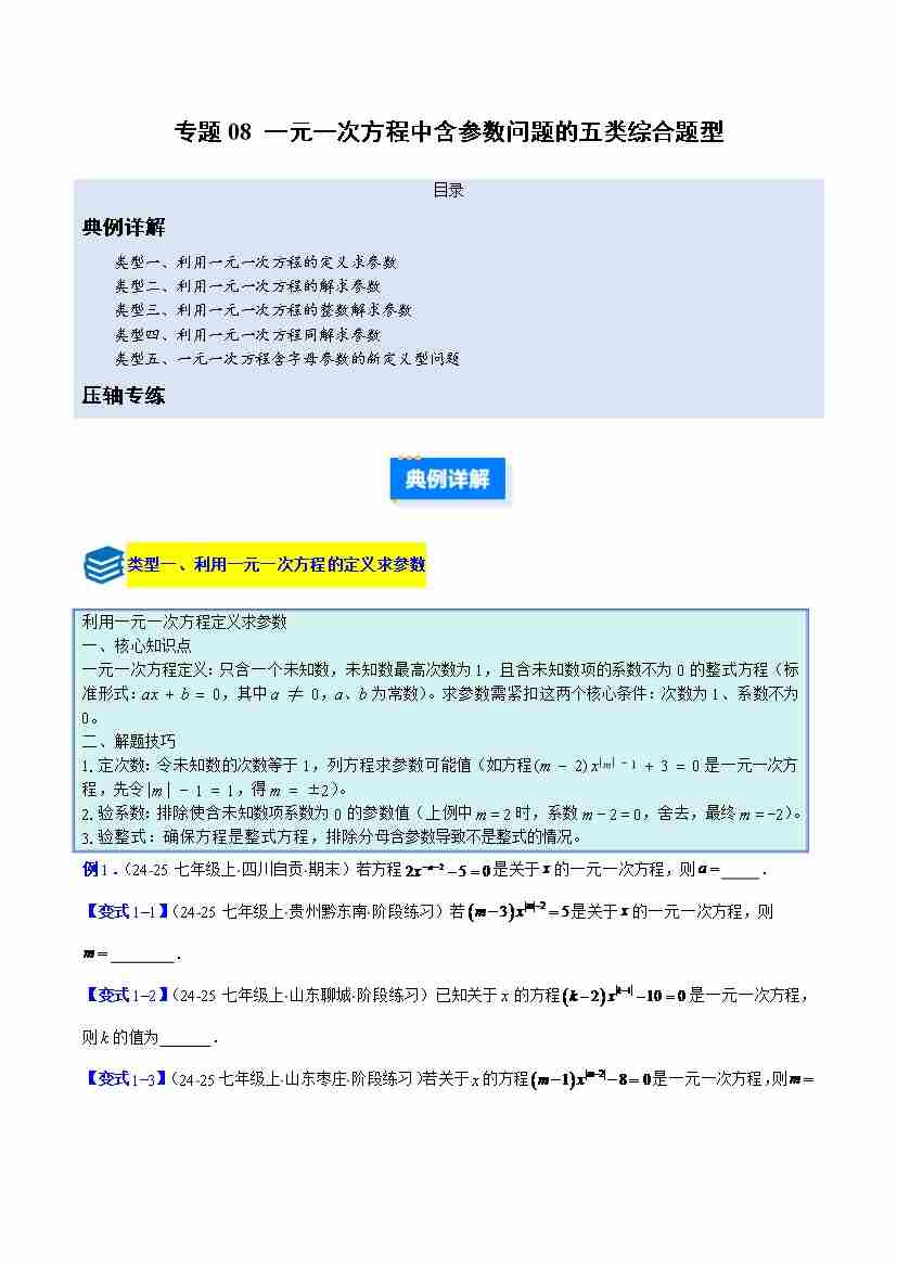 专题08 一元一次方程中含参数问题的五类综合题型(压轴题专项训练)(学生版)