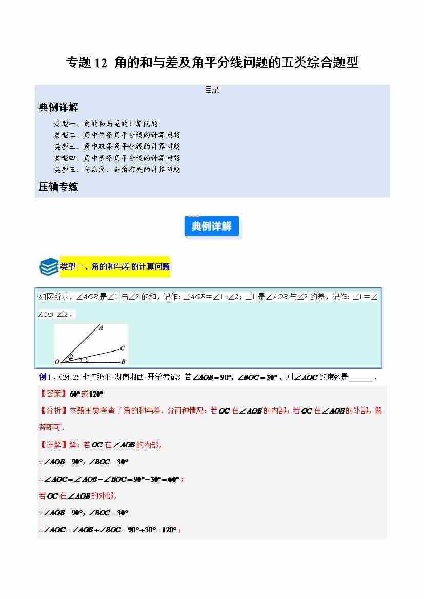 专题12 角的和与差及角平分线问题的五类综合题型(压轴题专项训练)(教师版)