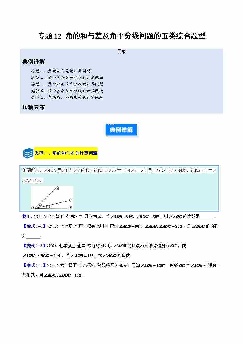专题12 角的和与差及角平分线问题的五类综合题型(压轴题专项训练)(学生版)