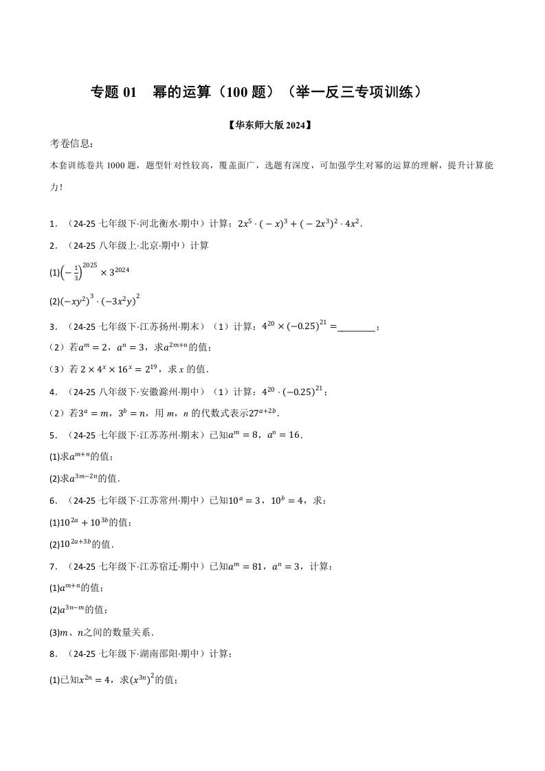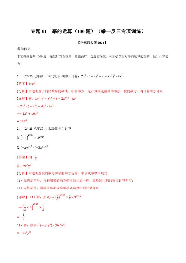 专题01 幂的运算(100题)(举一反三专项训练) (学生版)