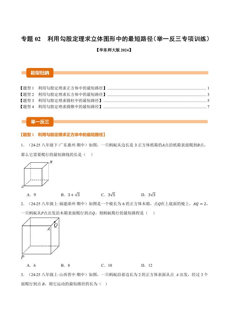 专题02 利用勾股定理求立体图形中的最短路径(举一反三专项训练)(原卷版)