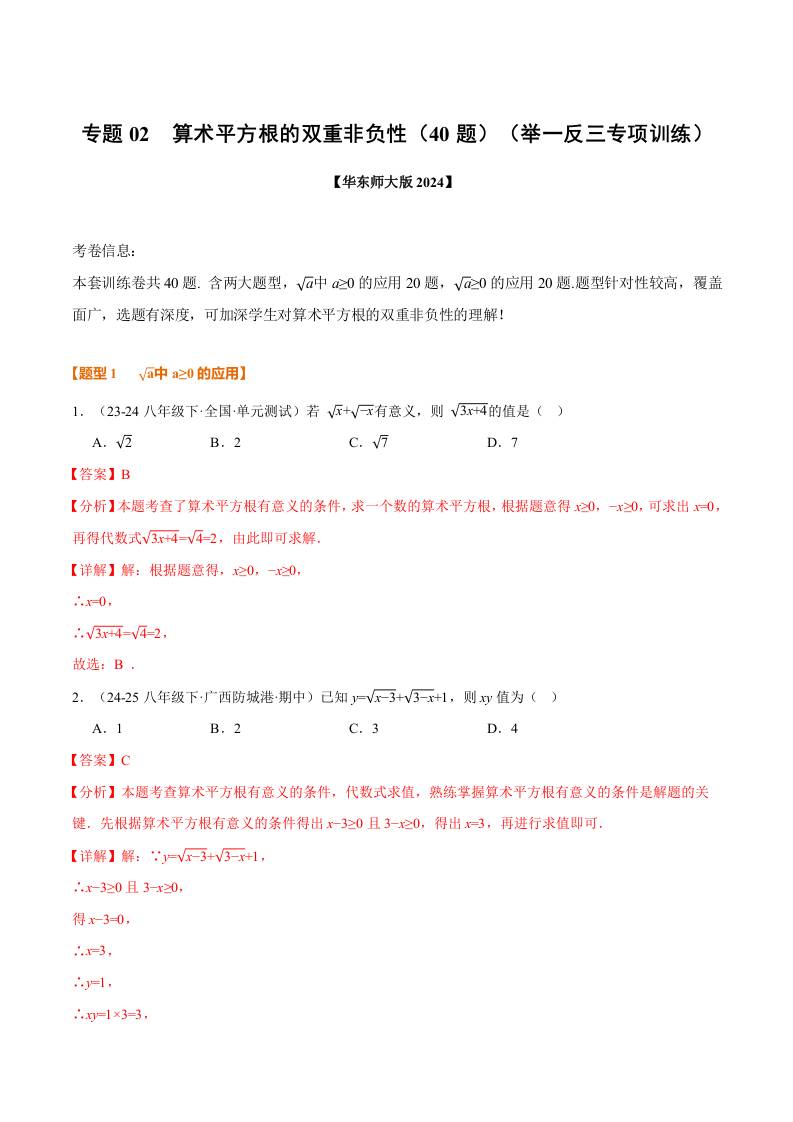 专题02 算术平方根的双重非负性(40题)(举一反三专项训练)(教师版)