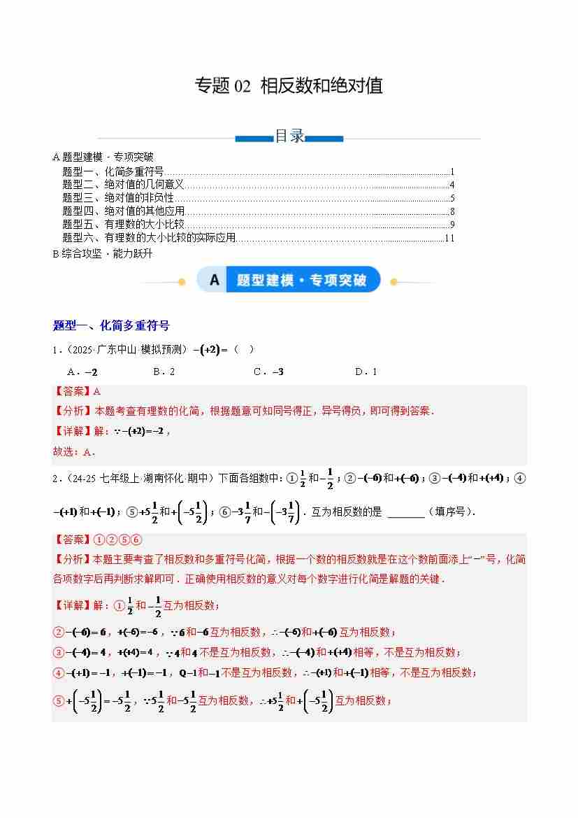 专题02 相反数和绝对值(专项训练)(教师版)数学华东师大版