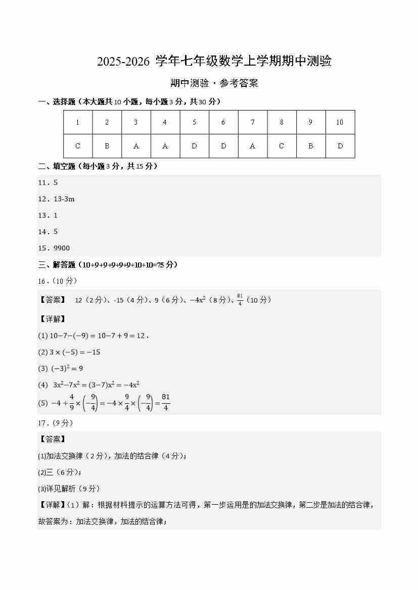 七年级数学上学期期中模拟(华东师大版2024,高效培优·提升卷)(参考答案)