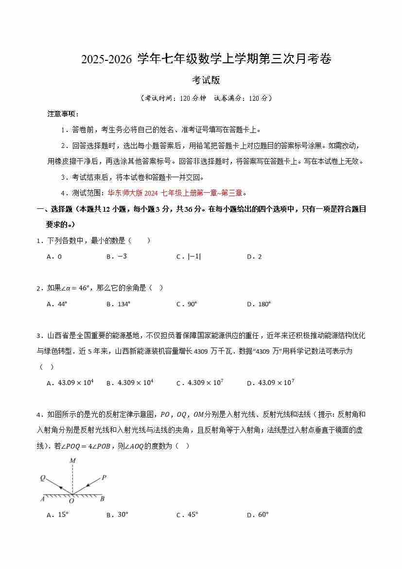 七年级数学上学期第三次月考(华东师大版2024第1~4章,高效培优)(考试版A4)