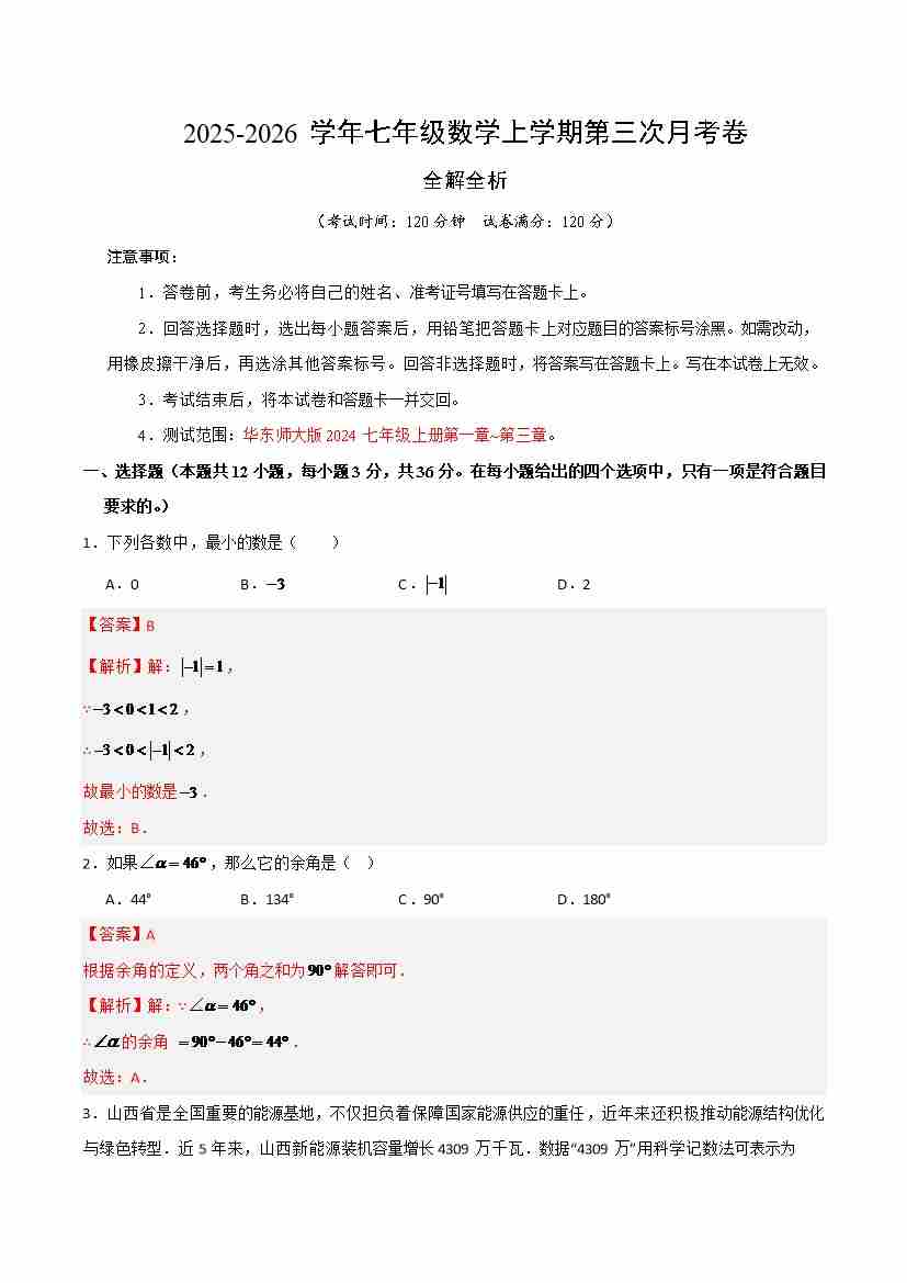 七年级数学上学期第三次月考(华东师大版2024,高效培优)(全解全析)