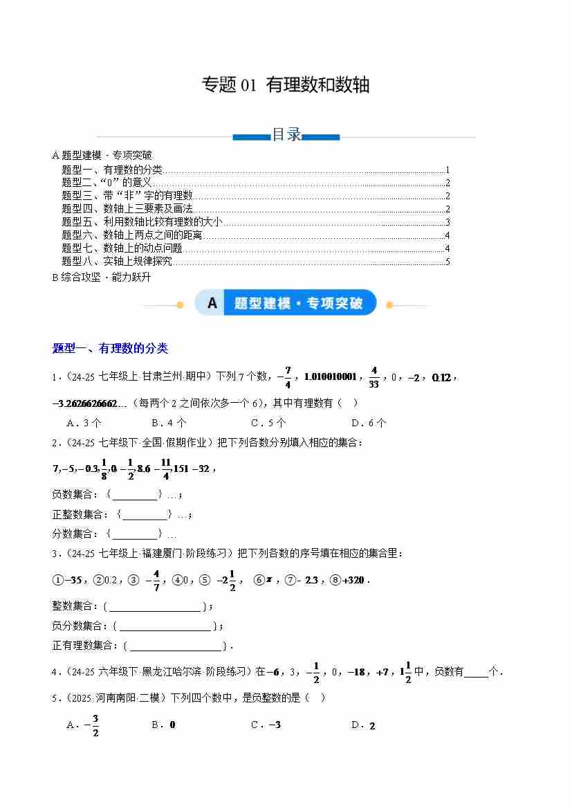 专题01 有理数和数轴(专项训练)(学生版)数学华东师大版