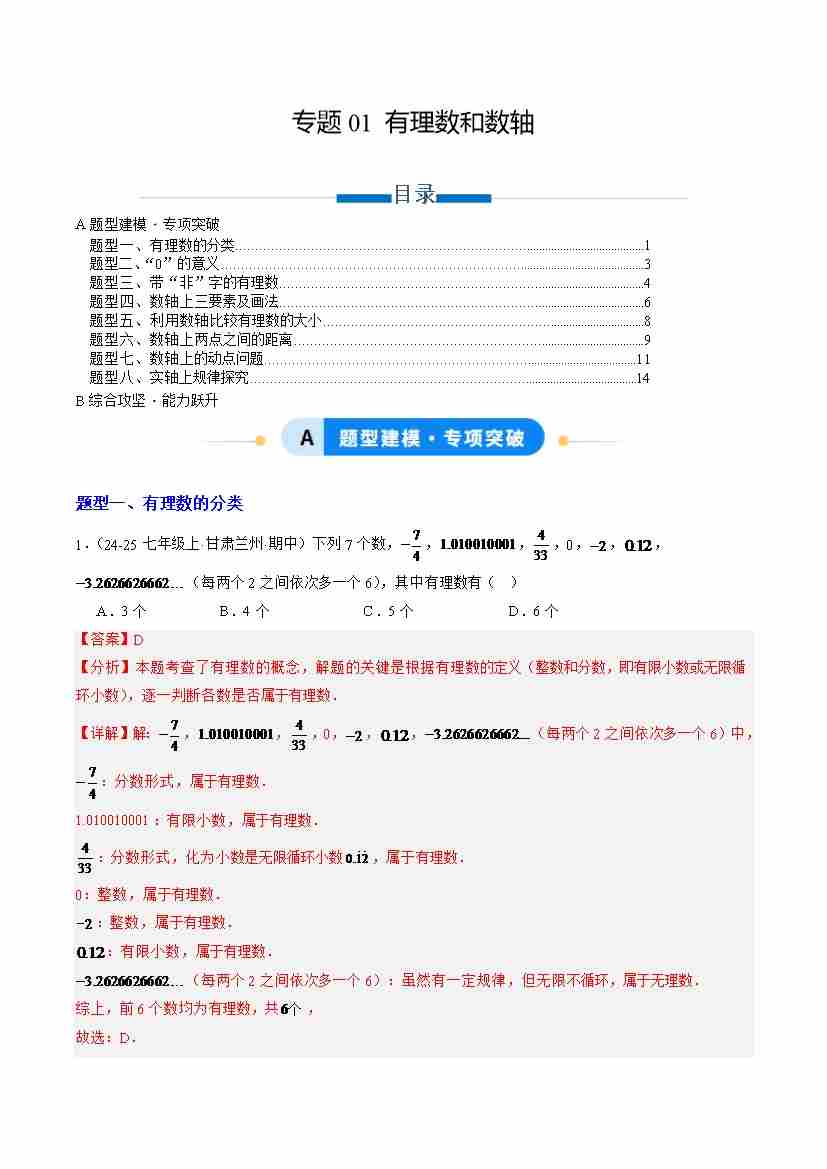 专题01 有理数和数轴(专项训练)(教师版)数学华东师大版