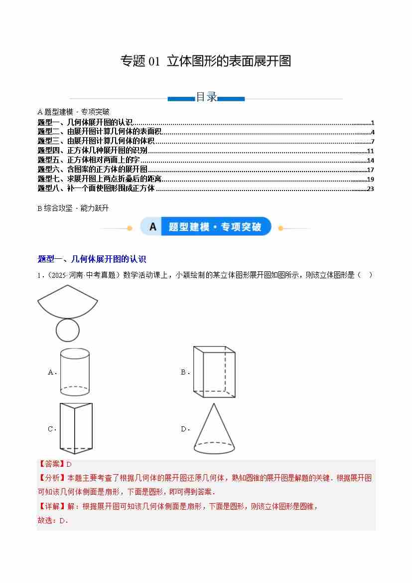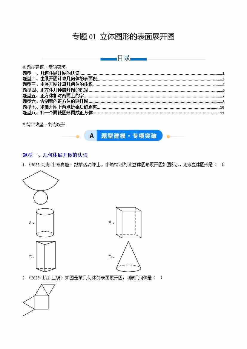 专题01 立体图形的表面展开图(专项训练)(学生版)