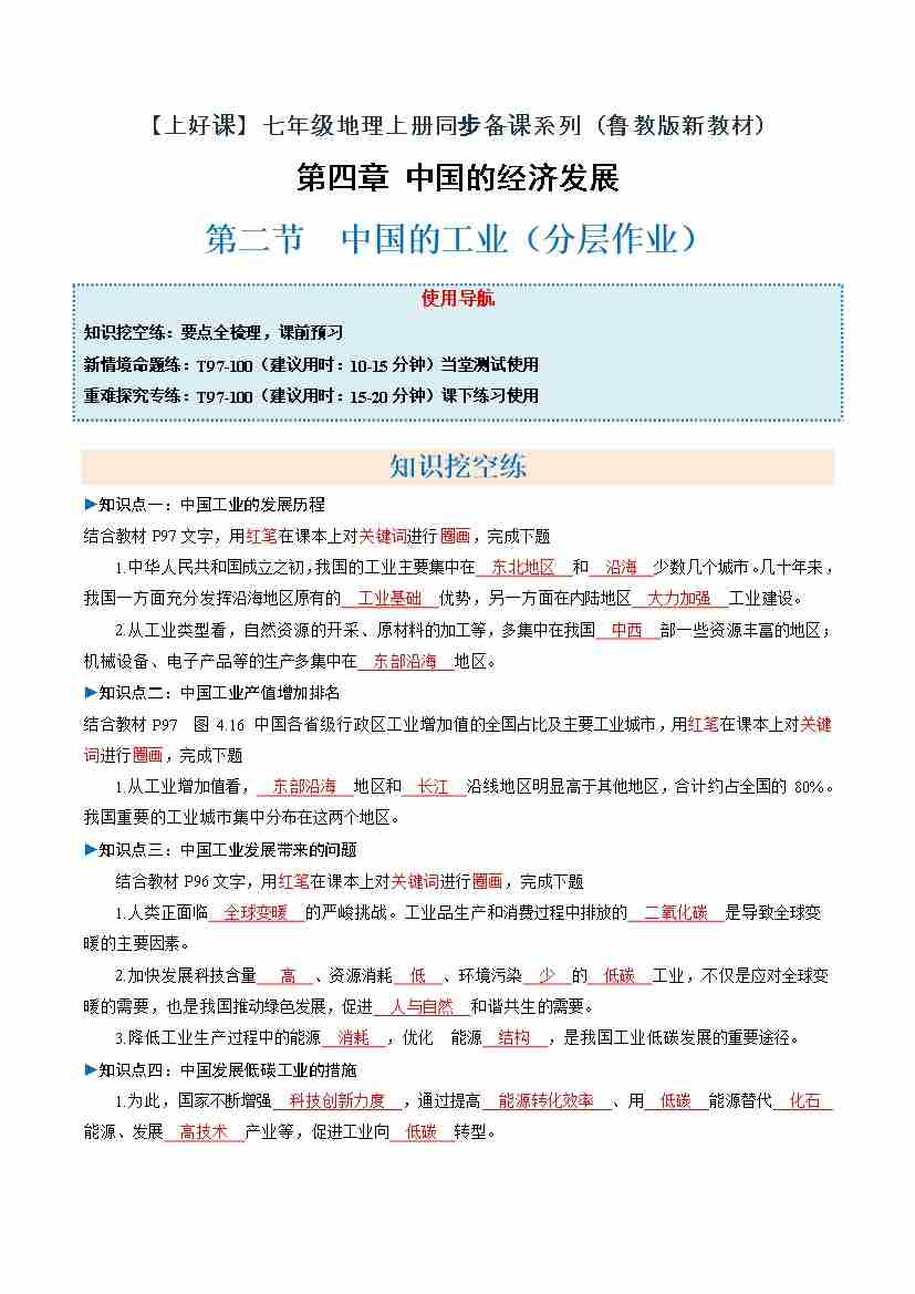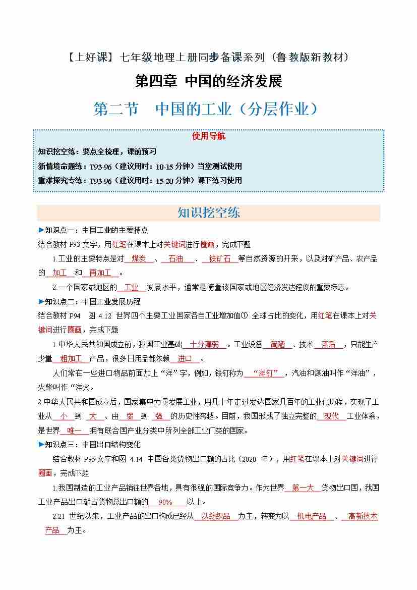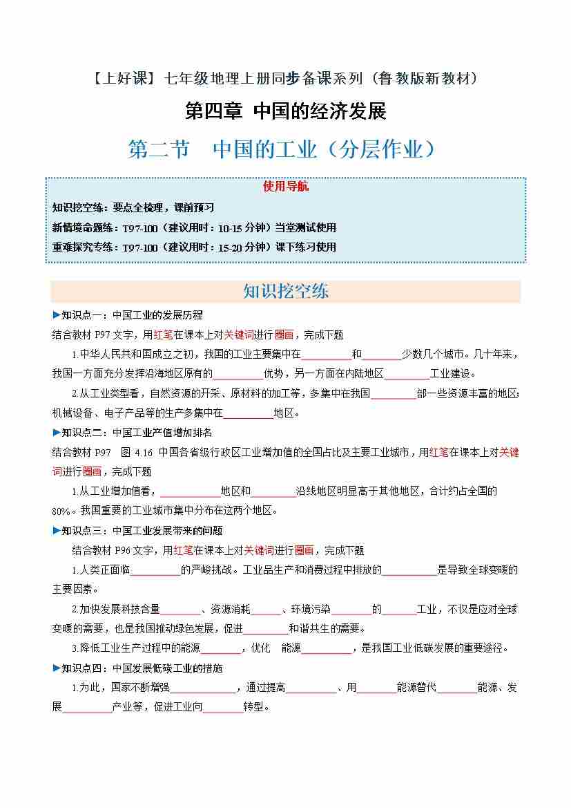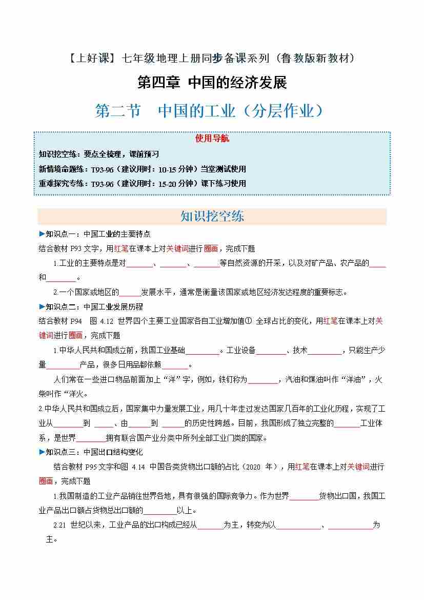 中国的工业第二课时(分层作业)(原卷版)
