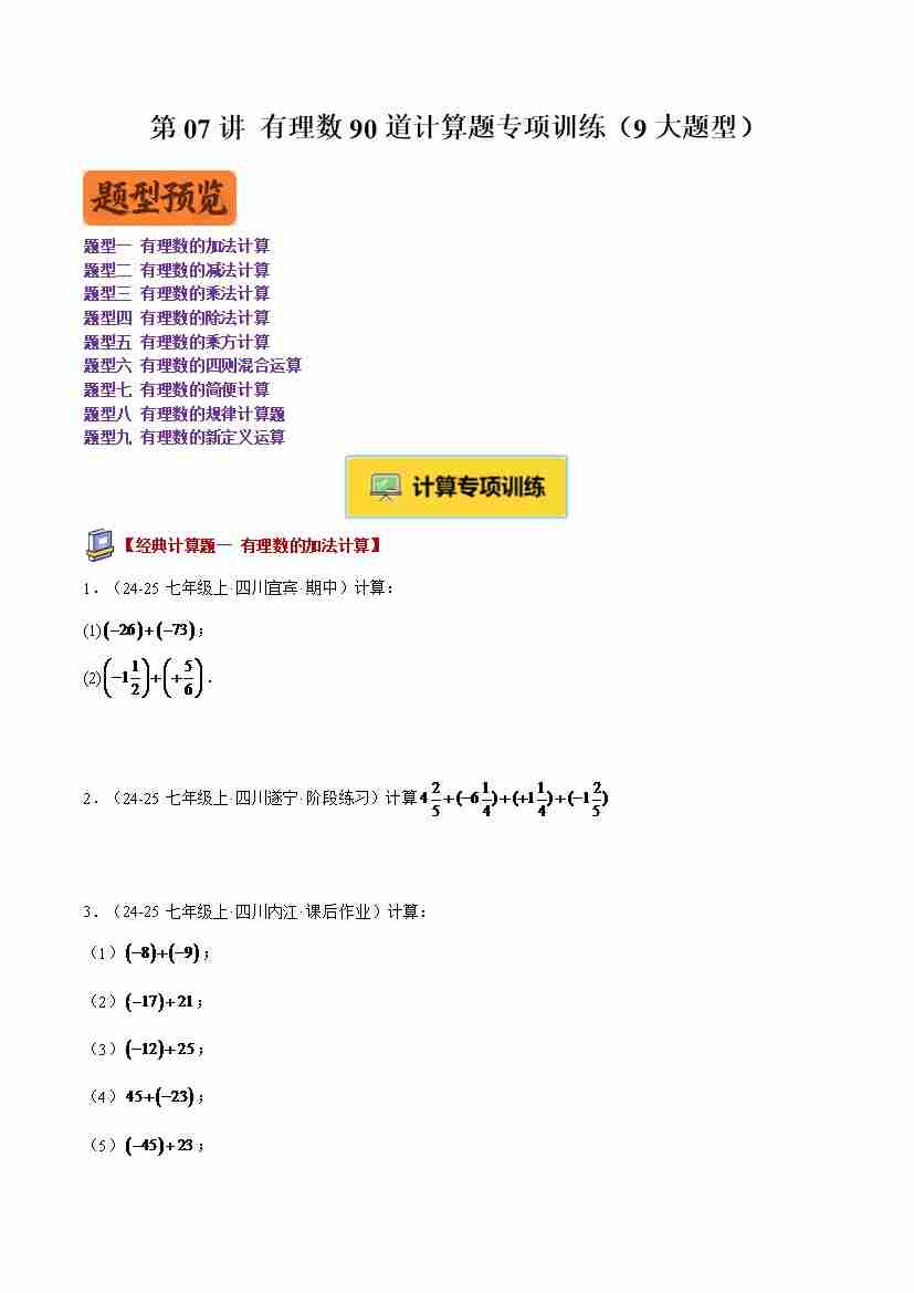专题07 有理数90道计算题专项训练(9大题型)(原卷版)