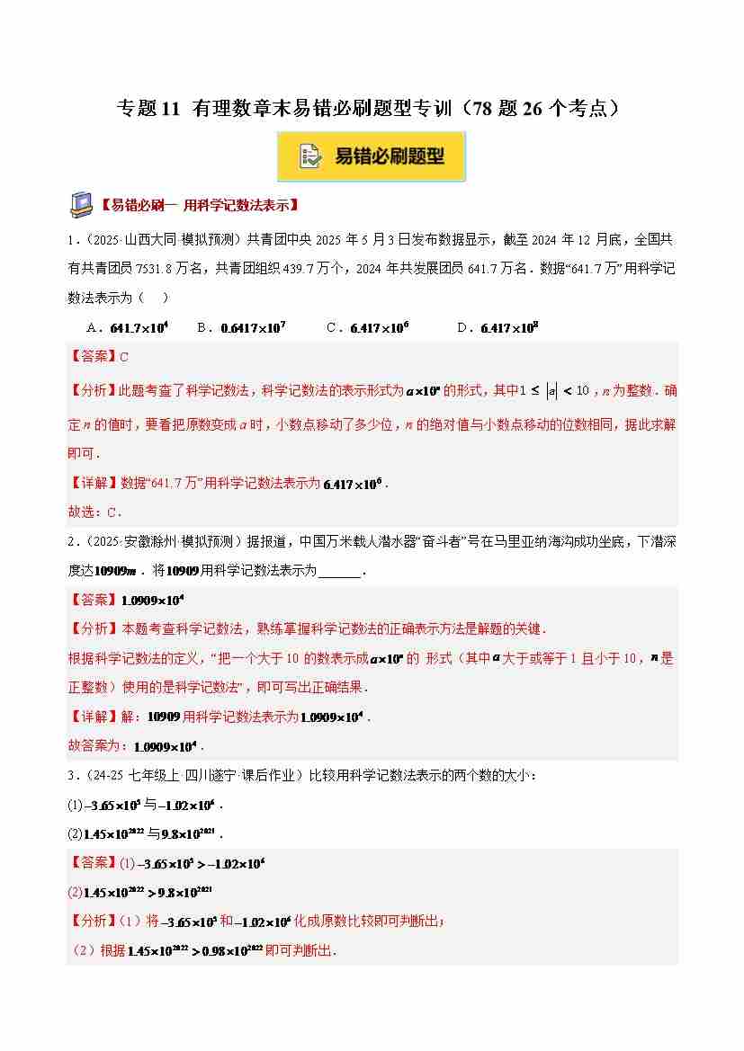 专题11 有理数章末易错必刷题型专训(78题26个考点)(解析版)