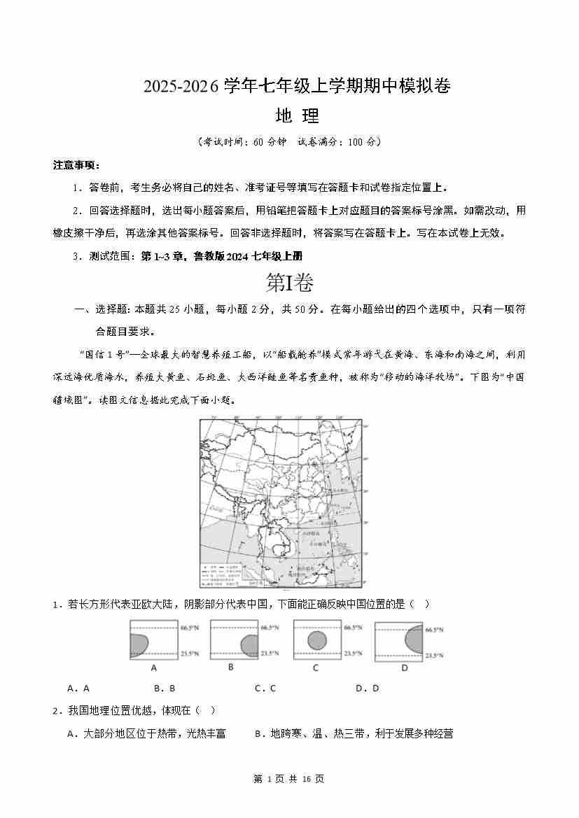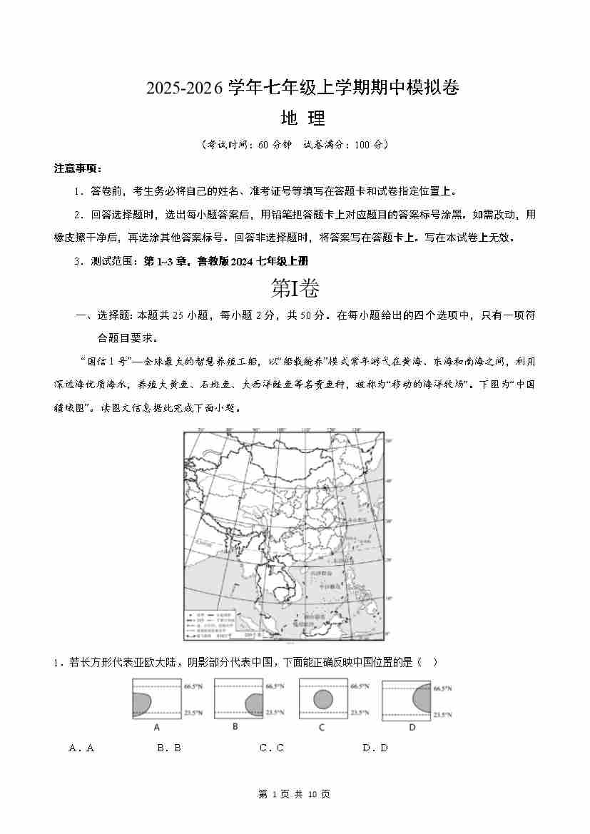 七年级地理上学期期中模拟卷01(鲁教版2024)(A4版)