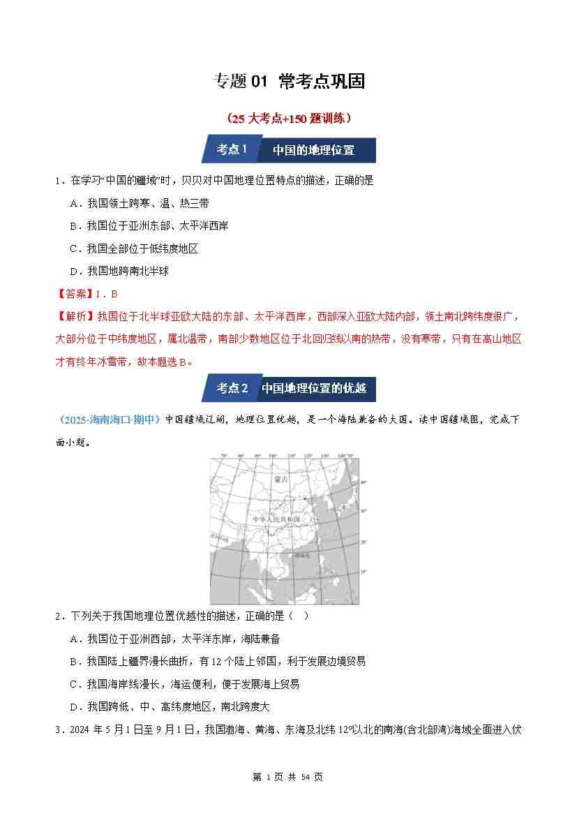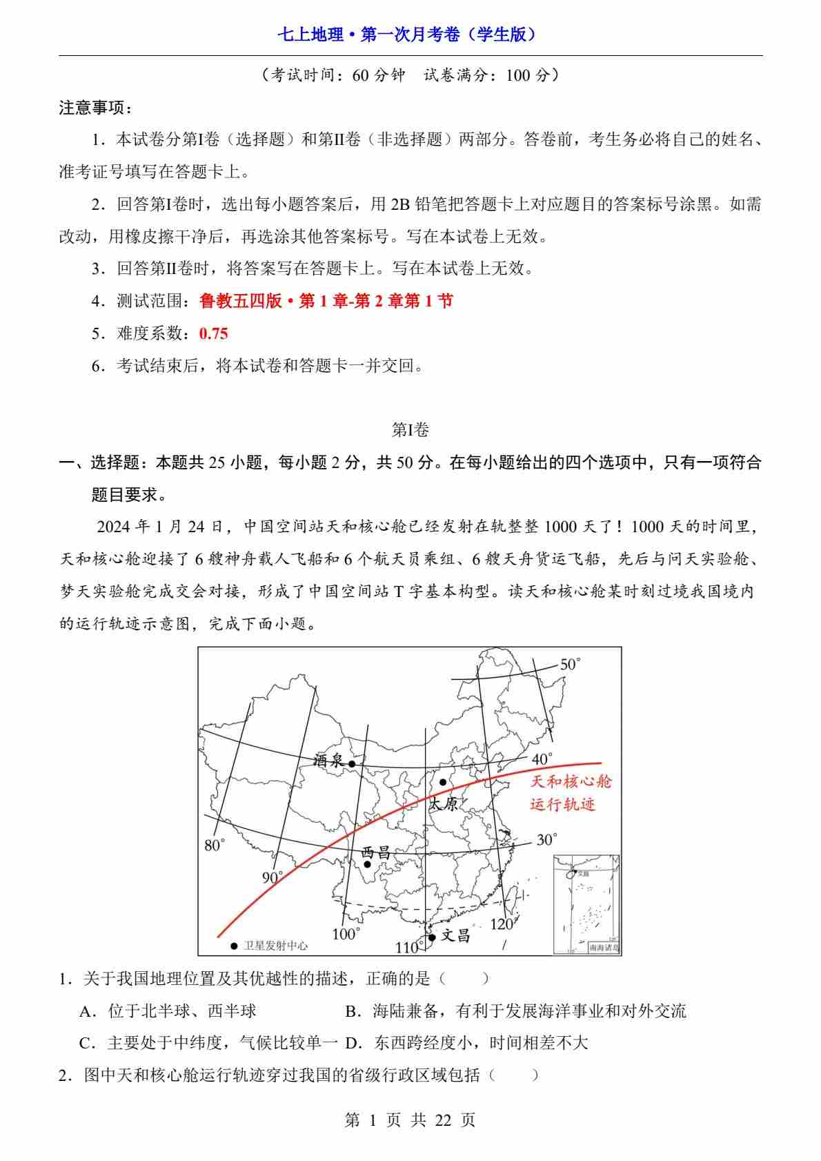 【鲁教54】7上地理期中卷【第1.1-3.2章】
