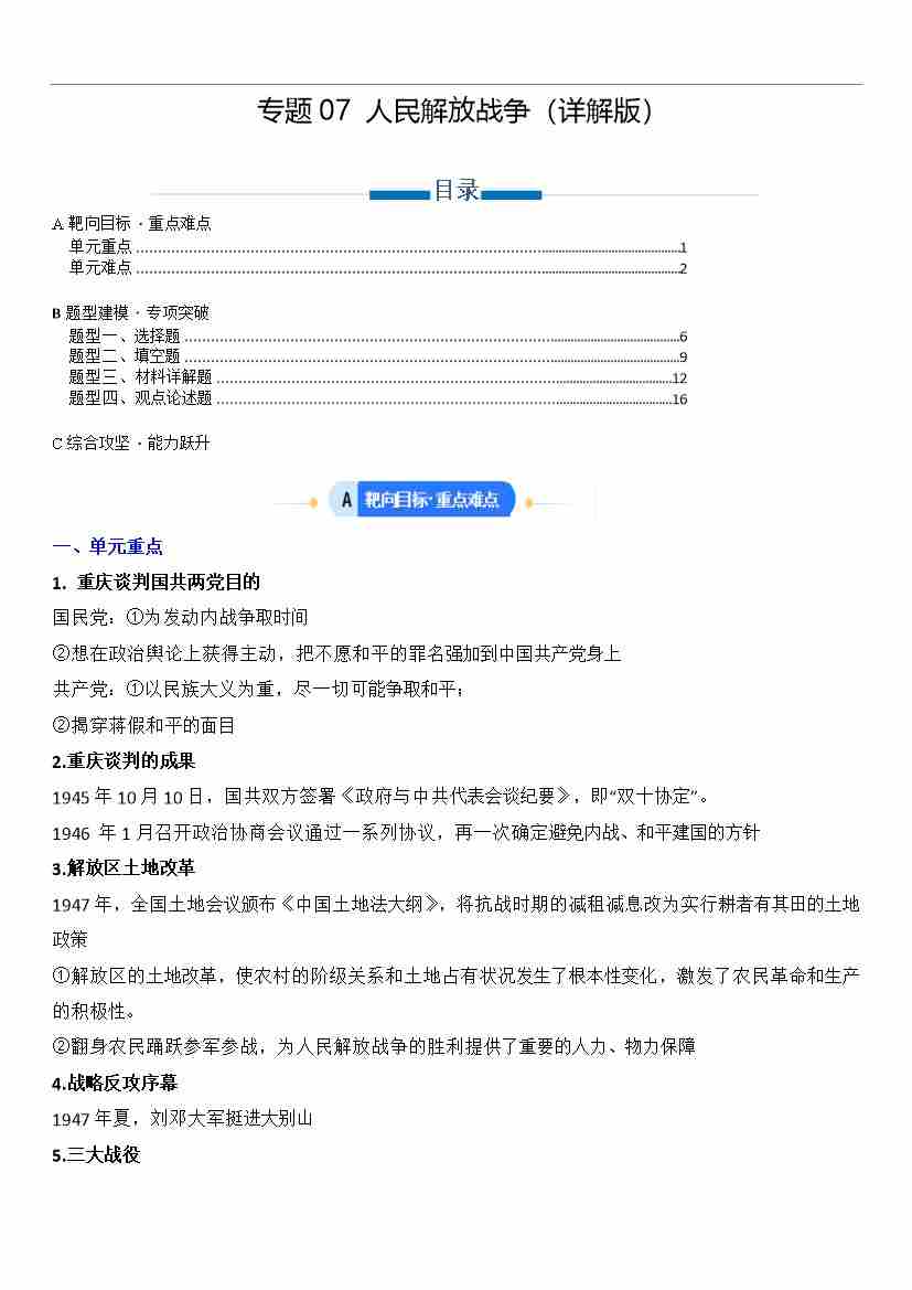 【八上历史】专题07人民解放战争(专项训练)(解析版)