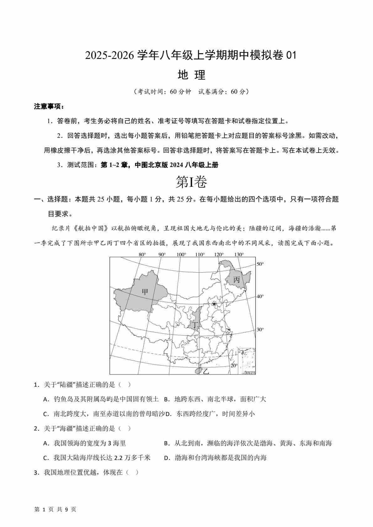 第1章认识中国的疆域和人口 测试·基础卷(考试版A4)