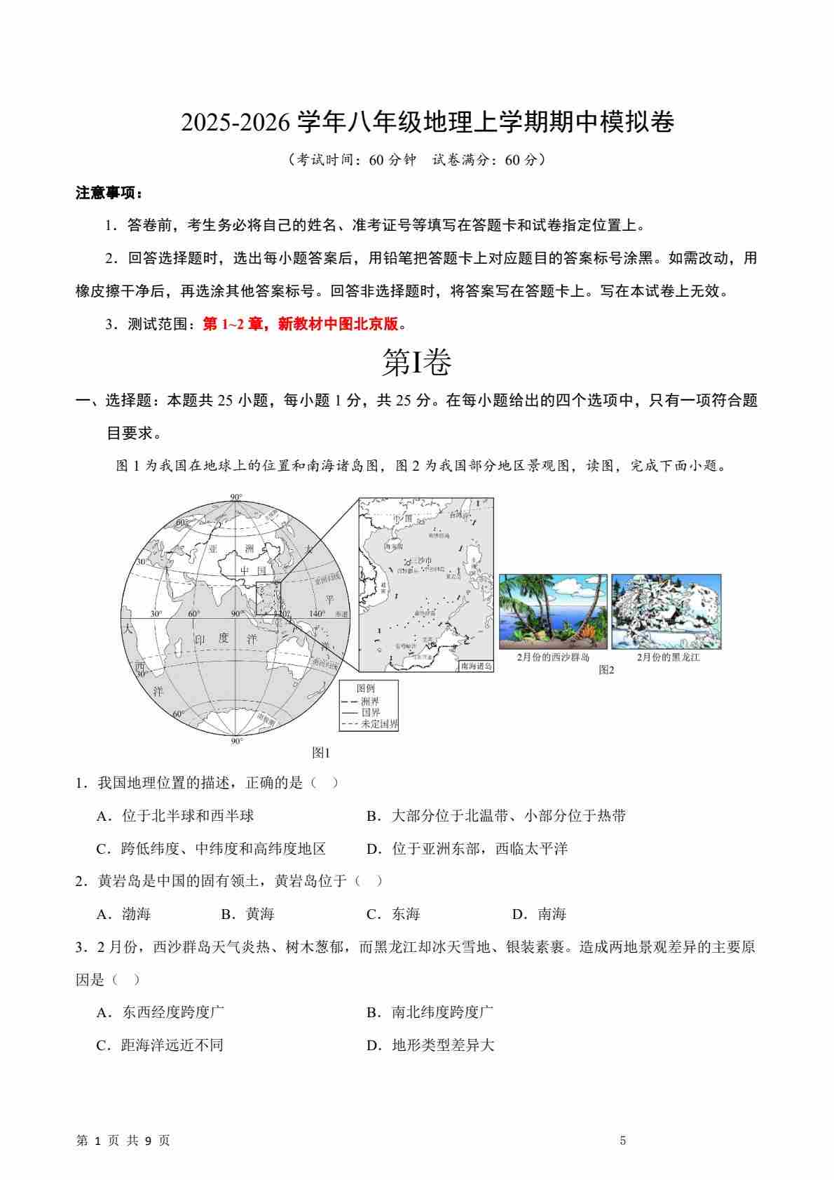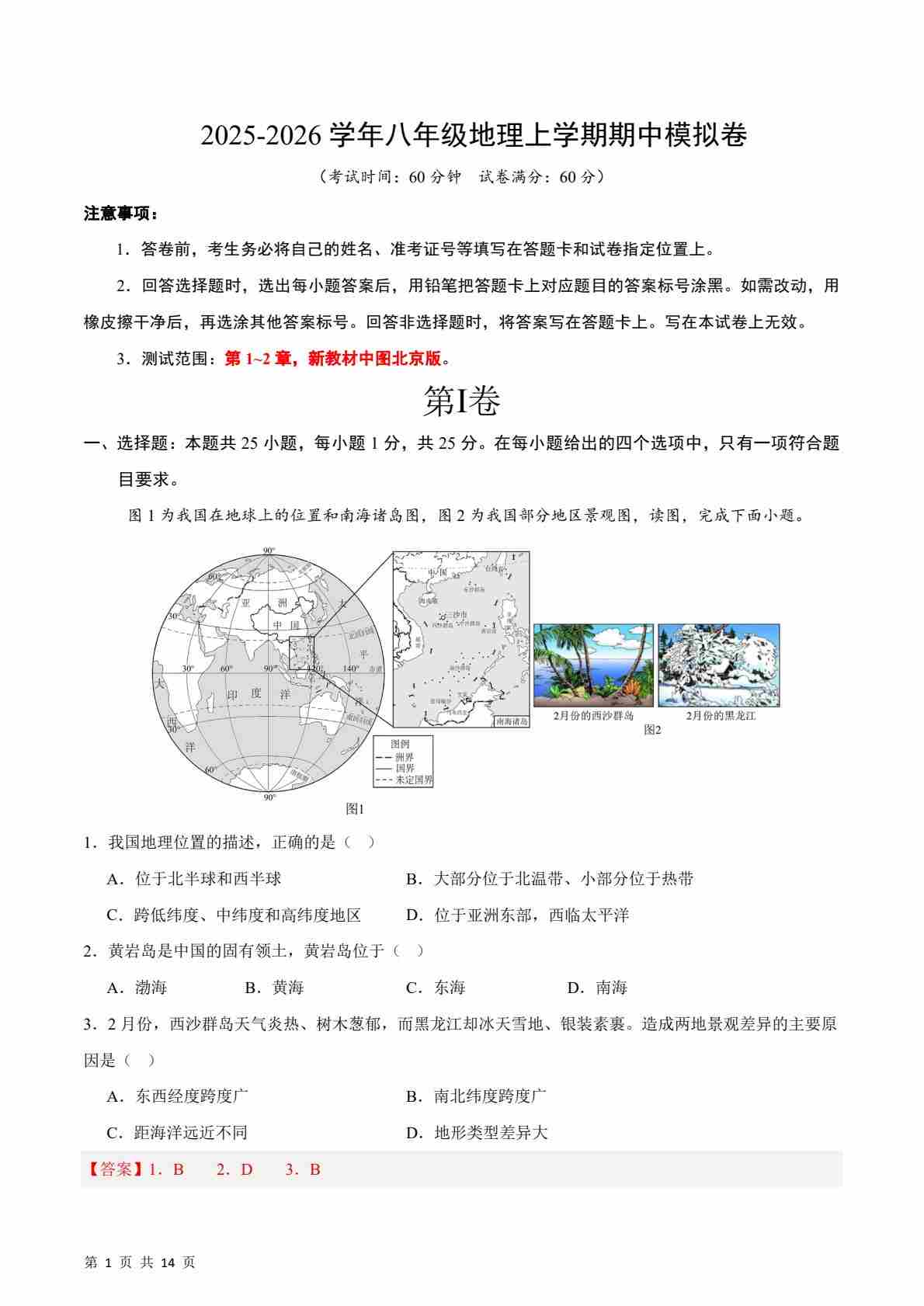 八年级地理上学期期中模拟卷(答案版)(新教材中图北京版)