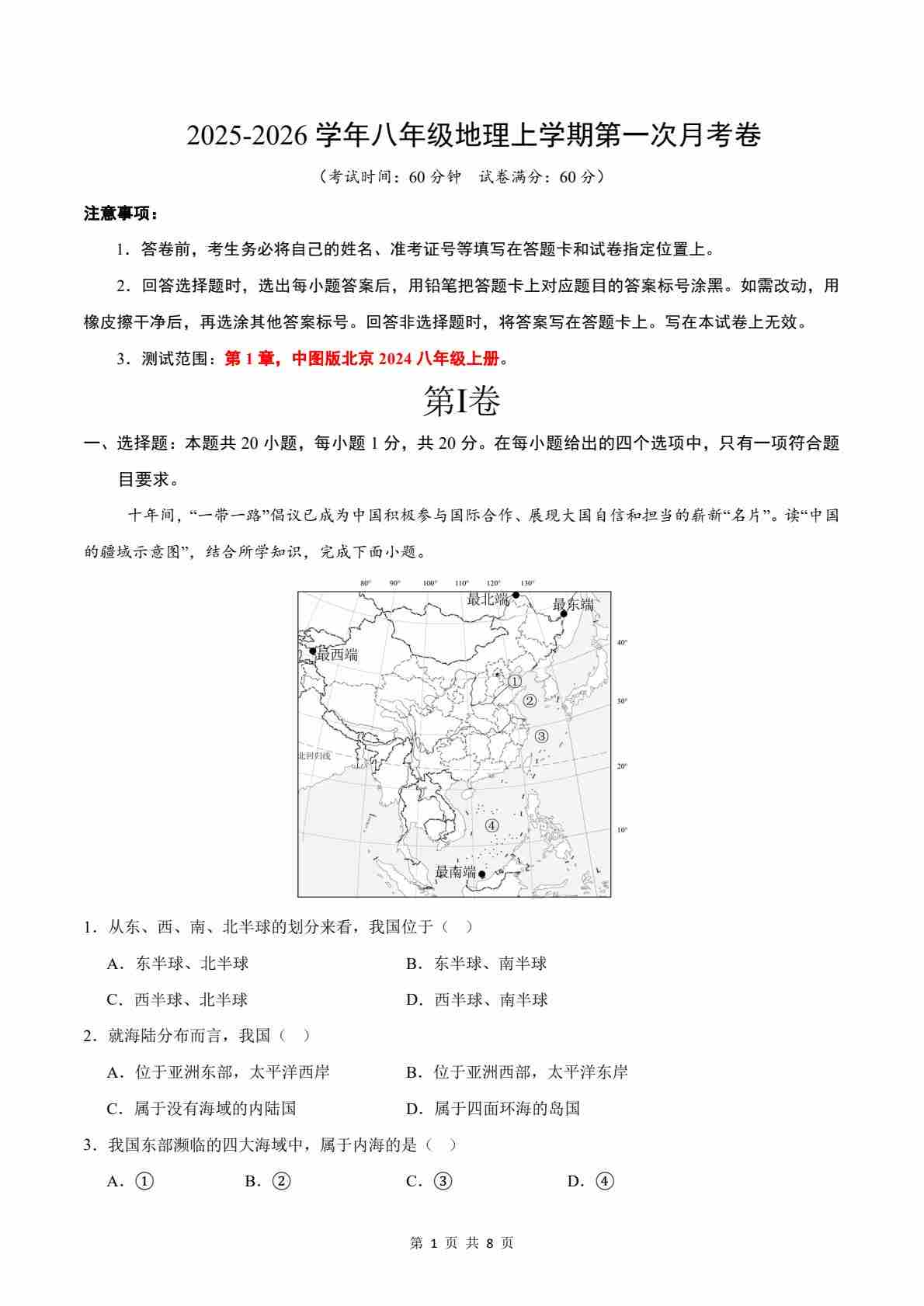 八年级地理第一次月考卷(考试版)【测试范围:中图版(北京)2024,第1章】